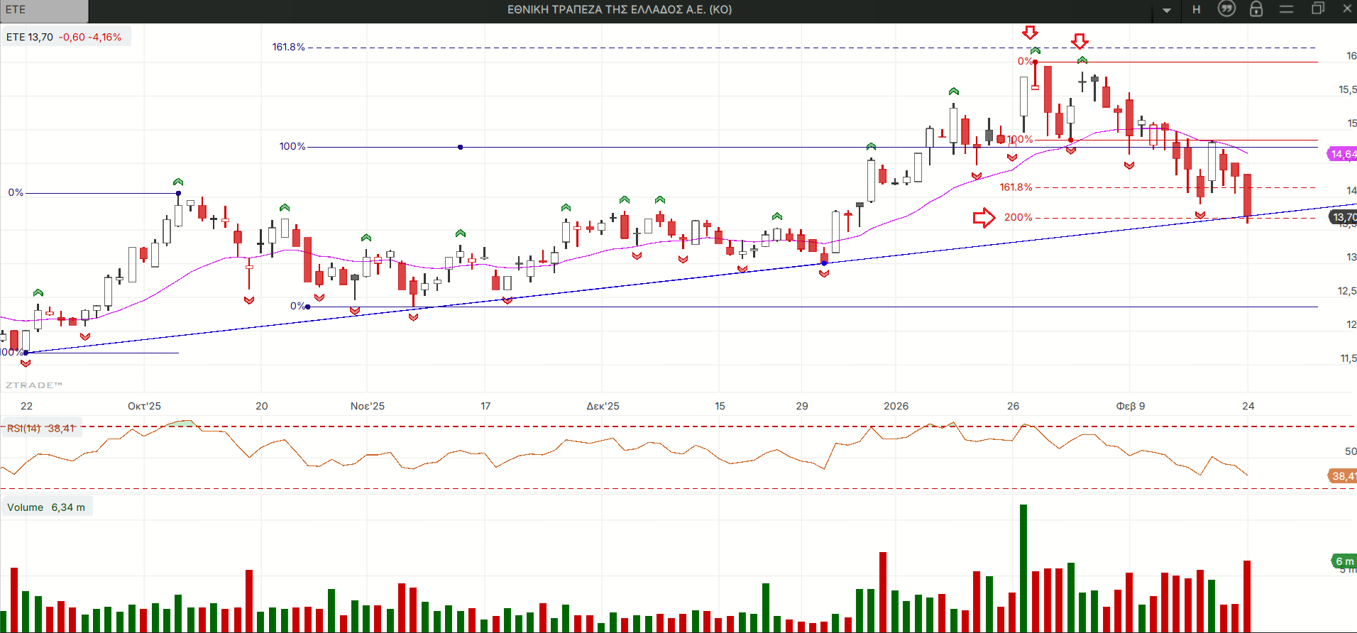 Οι τιμές μετά την ουσιαστική επίτευξη του στόχου του μικρότερου από τους σχηματισμούς διπλού πυθμένα (Δ.Π) που είχαν σχηματιστεί βούτηξαν και πάλι φθάνοντας χθες στην παραβίαση της οριζόντιας στήριξης στο ημερήσιο στα 7,00 ευρώ και ενώπιον των αντίστοιχων στηρίξεων του εβδομαδιαίου και όλης της περιόδου από τον Σεπτέμβριο και βέβαια πολύ μακριά από την επαλήθευση του καλού σεναρίου του μεγαλύτερου Δ.Π του ημερήσιου.