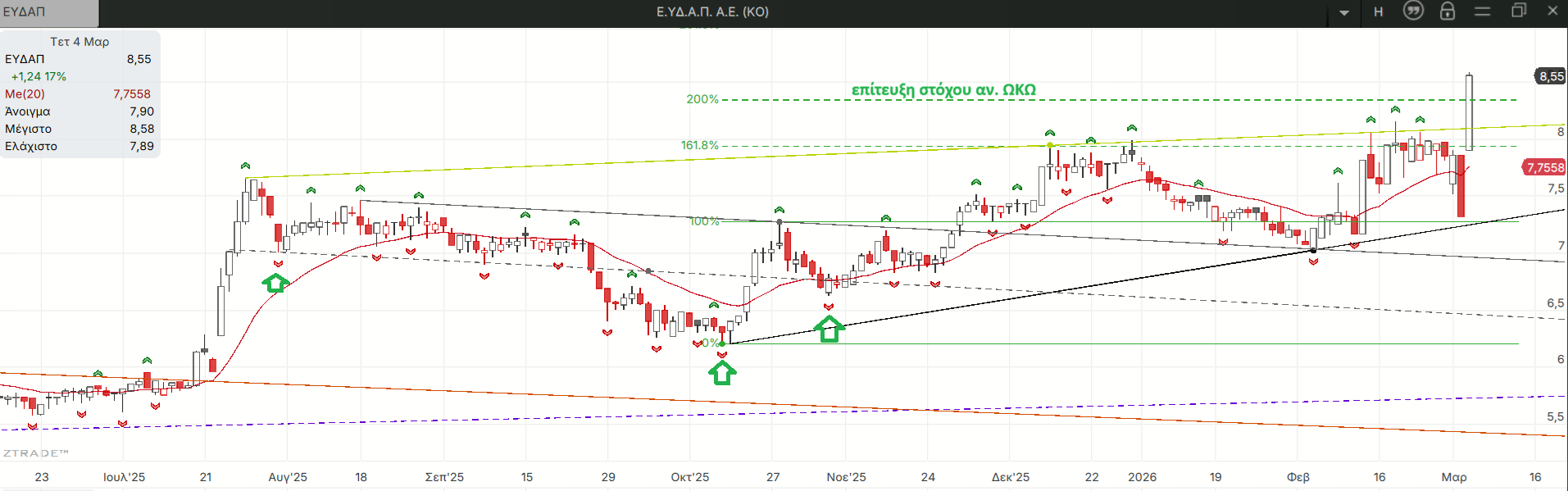 Νέα υψηλά τριών και πλέον ετών με διάσπαση του μαύρου συμμετρικού τριγώνου κι επίτευξη του μέγιστου στόχου του μικρότερου από τους ανοδικούς σχηματισμούς της είχαμε χθες στην ΕΥΔΑΠ που παρέμεινε σε ανοδική τάση παρά τη θύελλα των τελευταίων ημερών και είχε την καλύτερη απόδοση από τις μετοχές του FTSE L.C μετά τη χθεσινή βουτιά και τις ανακοινώσεις για ΓΕΚΤΕΡΝΑ.