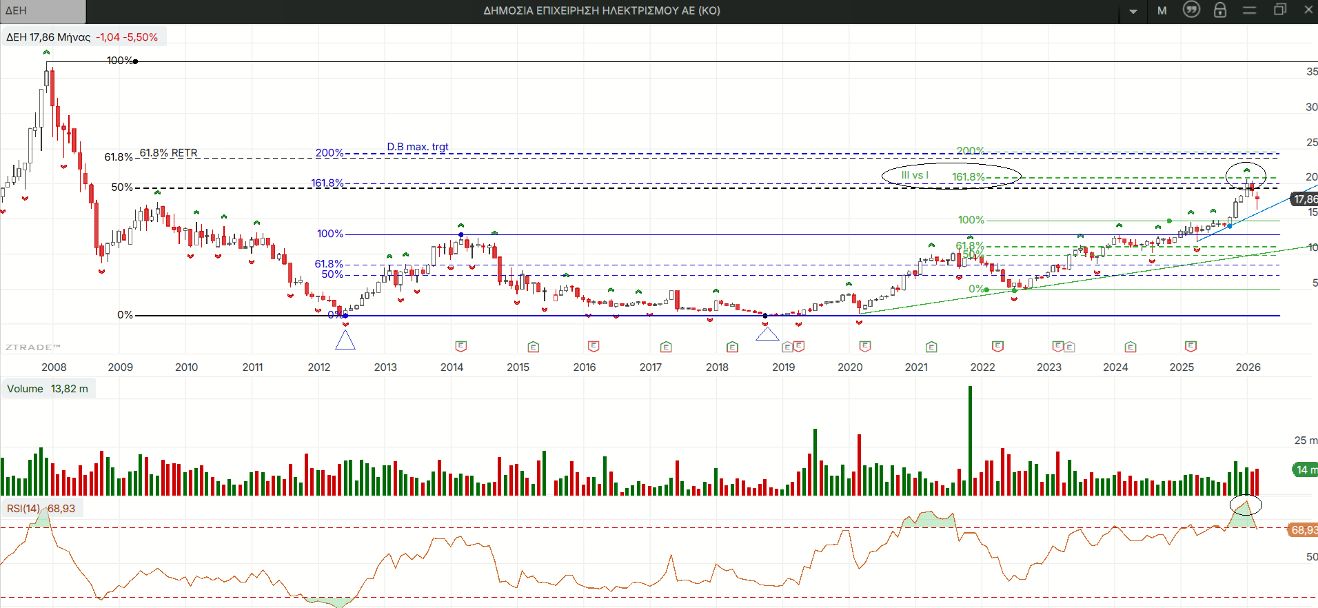 Σε συνέχεια των πολύ ενδιαφερουσών κυματικών εκτιμήσεων που ανέβηκαν εδώ κι εδώ στην προηγούμενη ανάρτηση για τη ΔΕΗ θα ρίξουμε μια ματιά στη μεγάλη εικόνα που παραμένει ανοδική με τις τιμές να διορθώνουν αφού έφθασαν βαθιά στην υπεραγορασμένη ζώνη του μηνιαίου κι εβδομαδιαίου RSI, και σε πιθανά σημαντικά επίπεδα fibo επέκταση ανοδικών κυμάτων με μακροπρόθεσμους στόχους ανοδικούς να εκκρεμούν.
