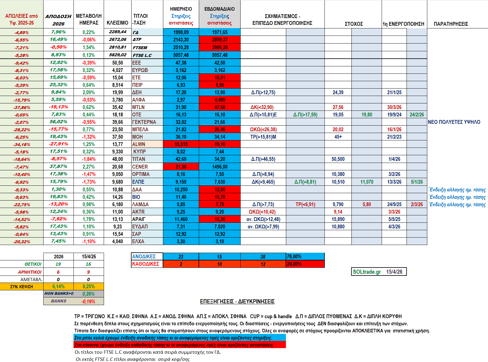 Εξαιρετική η χθεσινή συνεδρίαση για το ΧΑΑ αλλά και για τα μεγάλα ξένα χρηματιστήρια με τις τιμές των δεικτών αλλά και πολλών τίτλων να υπερβαίνουν τις οριζόντιες αντιστάσεις τους στο ημερήσιο και να δίνουν ένδειξη ανοδικής τάσης ακυρώνοντας και αρκετούς πτωτικούς σχηματισμούς όπως θα δούμε στους πίνακες που ακολουθούν όπου έχει προστεθεί και μια στήλη με τις αποδόσεις από την έναρξη του πολέμου οι οποίες πλέον είναι θετικές για αρκετές από τις 75 μετοχές του ΧΑΑ που παρουσιάζονται σε δυο ομάδες. Δυο από αυτές έγραψαν σήμερα νέα υψηλά όπως θα δούμε στις παρατηρήσεις: