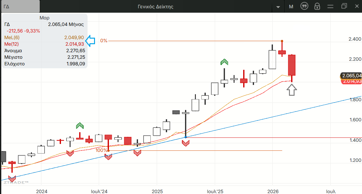 Με ένα σημαντικό ανοδικό γύρισμα έκλεισαν οι Ελληνικοί κι οι ξένοι δείκτες, ιδίως οι Αμερικανικοί, την τελευταία συνεδρίαση του 1ου τριμήνου του 2026 με αποτέλεσμα να αποφευχθεί μόλις την τελευταία στιγμή το κλείσιμο των ΓΔ, FTSE L.C και ΔΤΡ κάτω από τα σημαντικούς κινητούς alerts για τη μεσομακροπρόθεσμη τάση όπως είναι ο εκθετικός κινητός των 6 τελευταίων μηνιαίων χαμηλών (ΕΚΜΟ 6Χ) και των κλεισιμάτων των 12 τελευταίων μηνών (ΕΚΜΟ 12) όπως θα δούμε στα μηνιαία διαγράμματα που ακολουθούν: