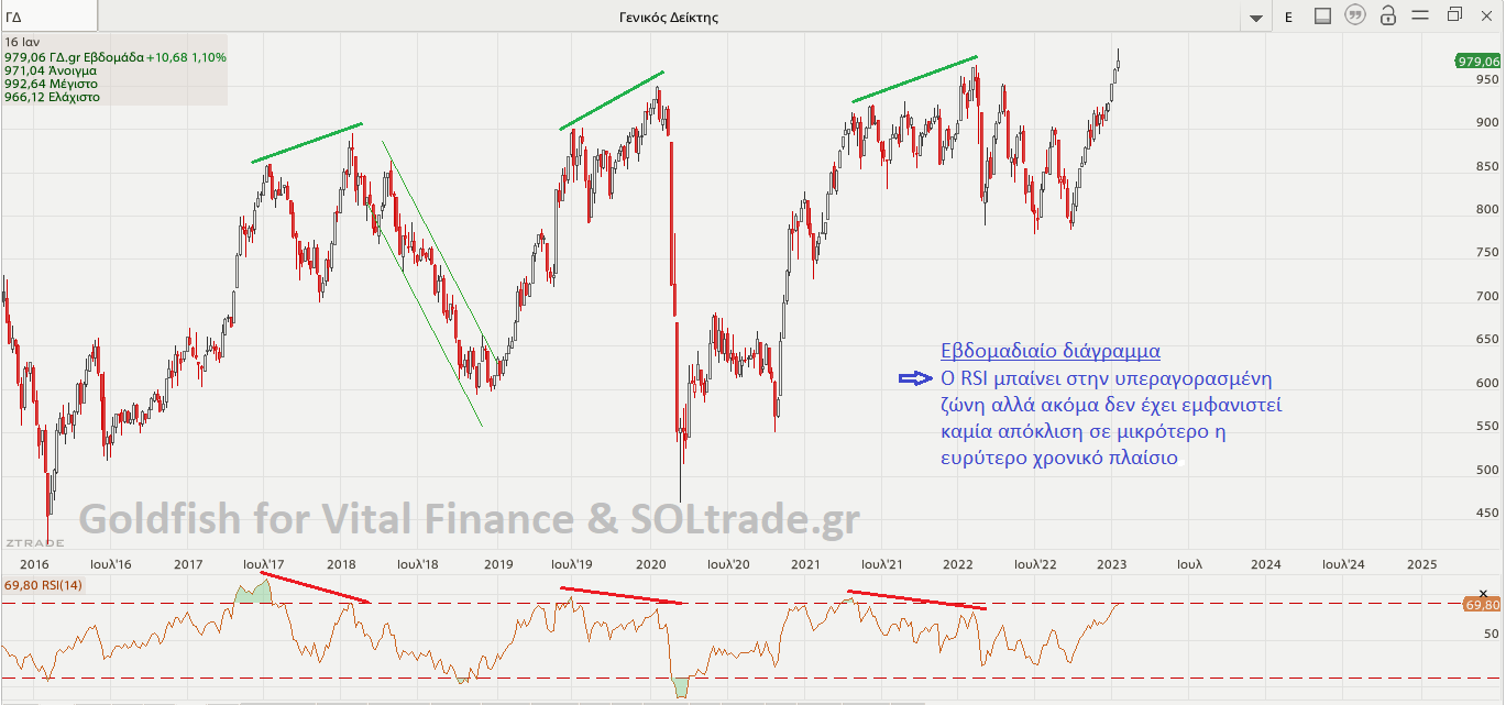 Όπως μπορούμε να δούμε στα διαγράμματα που ακολουθούν δεν έχει ακόμα εμφανιστεί κάποια απόκλιση σε εβδομαδιαίο και ημερήσιο διάγραμμα τιμών έναντι του RSI. Κατά το παρελθόν, τέτοιες αποκλίσεις ήταν ο κανόνας είτε βραχυχρόνια (στο ημερήσιο), είτε σε ευρύτερο πλαίσιο (εβδομαδιαίο):