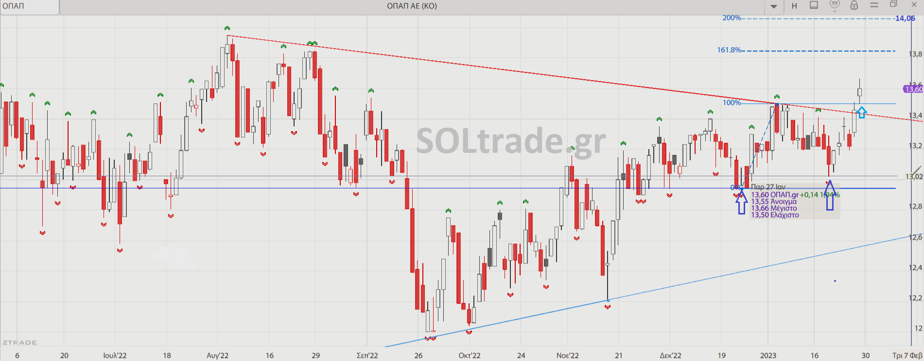 Ο ΟΠΑΠ επανήλθε τυπικά σε ανοδική τάση και στο εβδομαδιαίο ενεργοποιώντας κι ένα μικρό σχηματισμό διπλού πυθμένα στο ημερήσιο που δείχνει ότι οι τιμές έχουν πάρει για τα καλά το δρόμο τουλάχιστον για τις παράλληλες των γραμμών στήριξης που σημειώνονται στο εβδομαδιαίο και το μηνιαίο διάγραμμα στο οποίο βλέπουμε ότι έχει ενεργοποιηθεί κι ένας μακροπρόθεσμος σχηματισμός ανοδικής αναστροφής από τον διπλό πυθμένα του 2016 και του 2020. Η βραχυπρόθεσμη στήριξη βρίσκεται στους πυθμένες των 13,02 και 12,94 ευρώ κάτω από τους οποίους ακυρώνεται ο σχηματισμός.