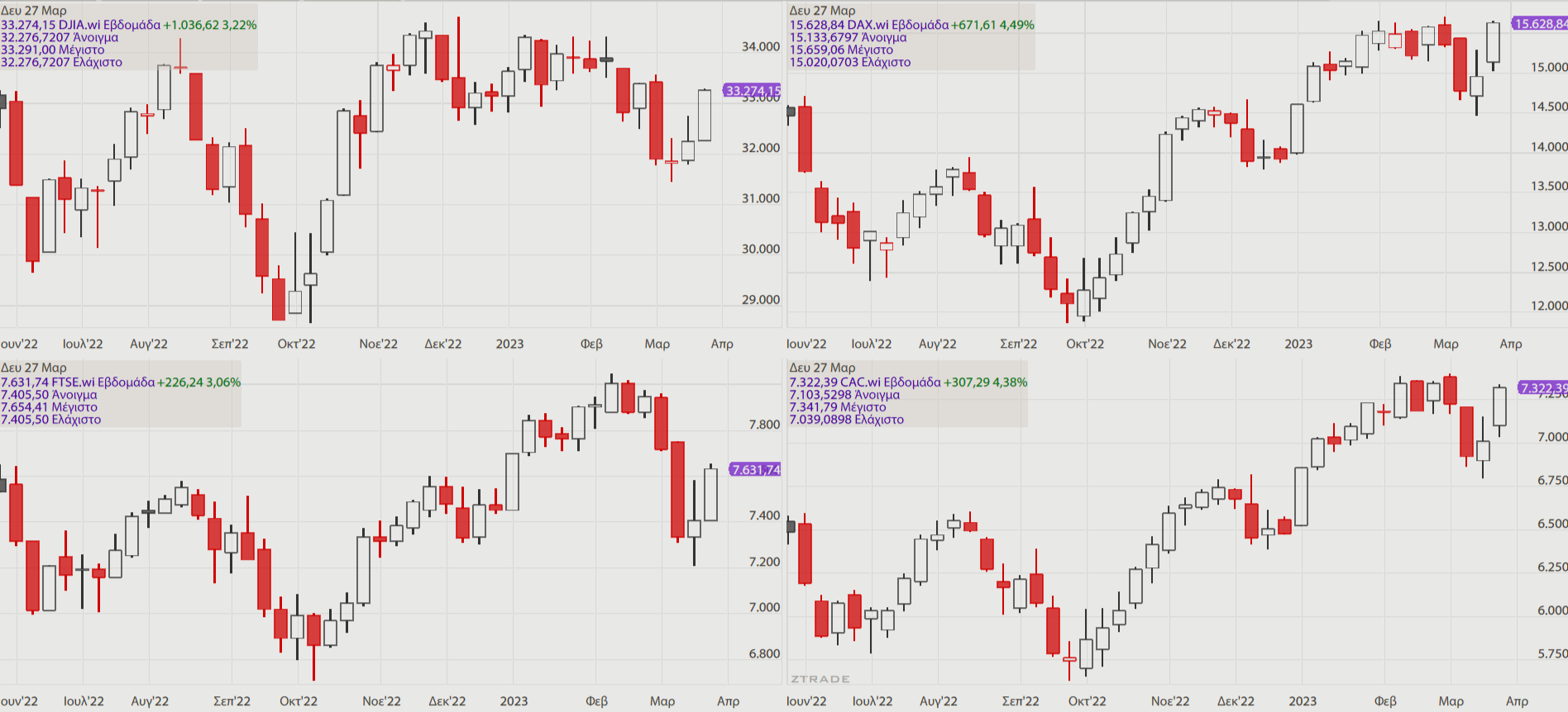 Nα κλείσουμε με μια ματιά στα εβδομαδιαία και μηνιαία διαγράμματα των 6 πιο σημαντικών Αμερικανικών και ευρωπαϊκών δεικτών που μάζεψαν σημαντικό μέρος των απωλειών του Μαρτίου κι αφήνουν ελπίδες για θετική συνέχεια.