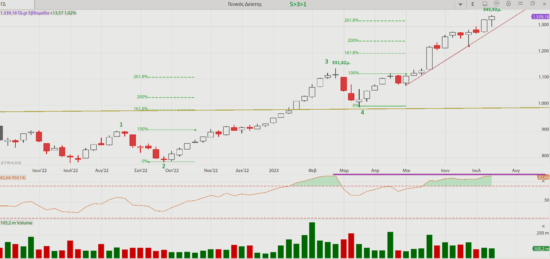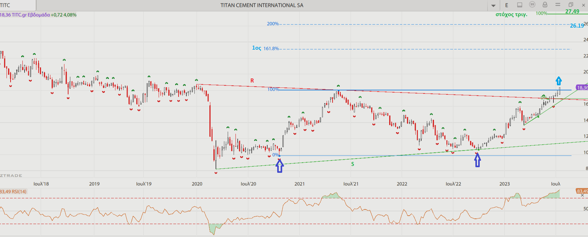 Στην ΤΙΤΑΝ είχαμε υπέρβαση και της 2ης αντίστασης στη μεγάλη εικόνα κι οι στόχοι τόσο του μεγάλου σχηματισμού διπλού πυθμένα που ενεργοποιήθηκε όσο και της ανοδικής διάσπασης του μεγάλου σχεδόν συμμετρικού τριγώνου να βρίσκονται πολύ ψηλότερα από τα τρέχοντα επίπεδα.