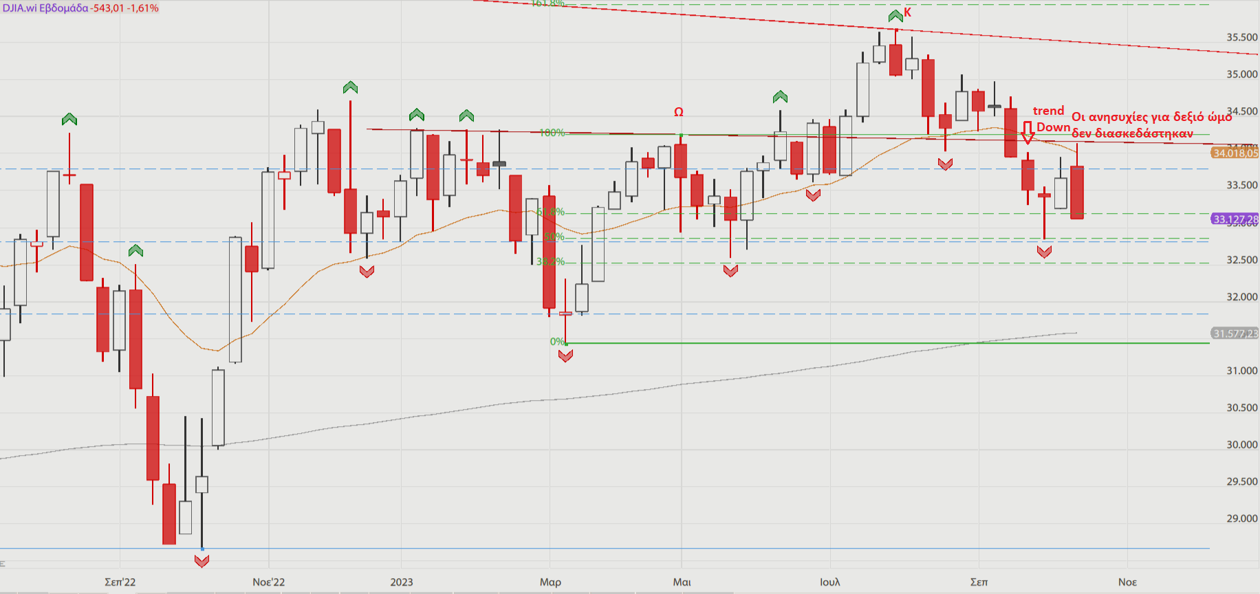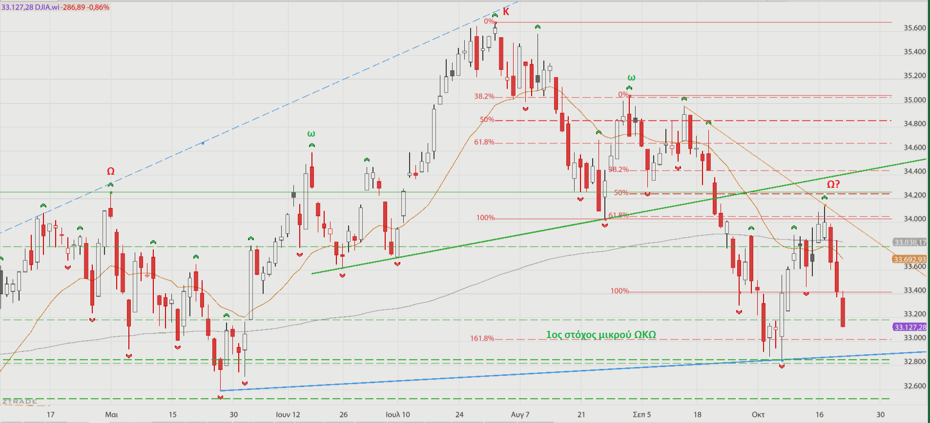 Στον DJIA ο 1ος τόχος του μικρότερου ΩΚΩ έχει επιτευχθεί κι αν πάμε σε νεότερα χαμηλά θα ενεργοποιηθεί κι ο μεγαλύτερος ΩΚΩ που μπορεί να δώσει τιμές χαμηλότερα από το χαμηλό του Μαρτίου. Και εδώ η τάση στο εβδομαδιαίο είναι καθοδική.