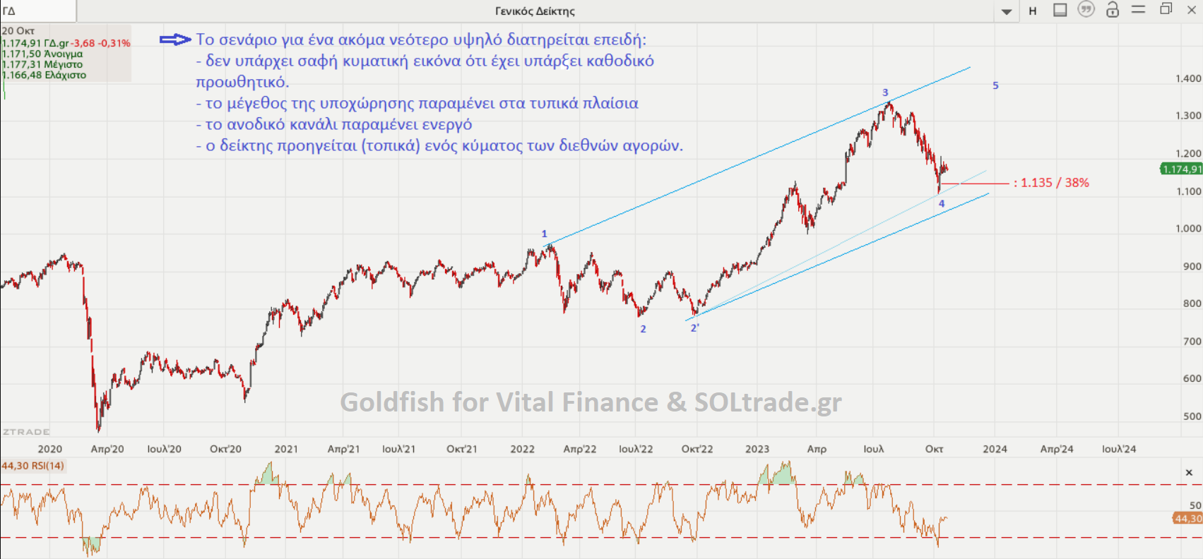 Αν πράγματι αρνηθεί τα νεότερα τοπικά χαμηλά (που είναι το πιθανότερο), τότε στο σενάριο μίας κάποιας ανοδικής ανακούφισης στις διεθνείς αγορές ο Γ. Δείκτης θα προηγείται κυματικά. Με τα τρέχοντα δεδομένα υπάρχουν μία σειρά από λόγοι που διατηρούν ανοικτό το ενδεχόμενο επαναφοράς του δείκτη προς τα προηγούμενα υψηλά: