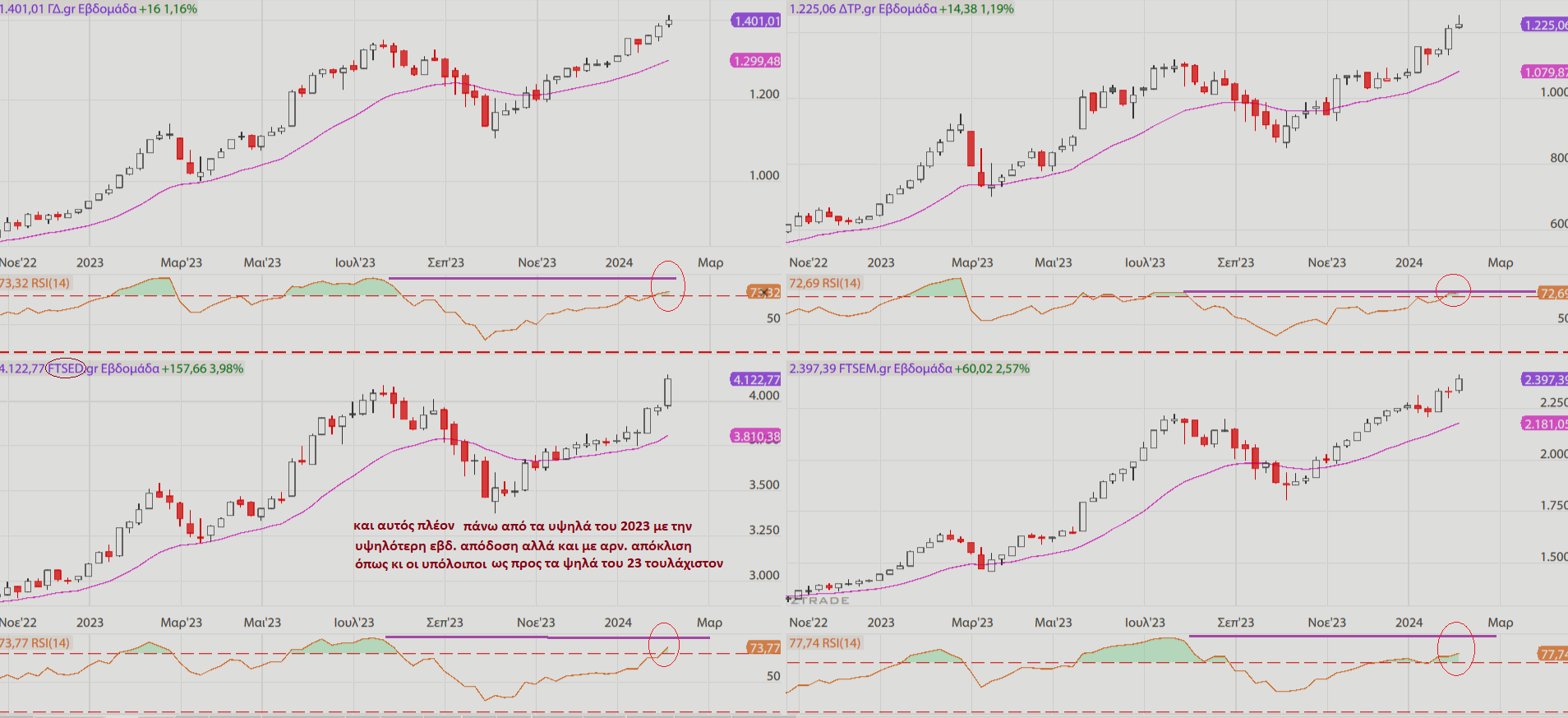 Aπό τους δικούς μας σημαντικούς δείκτες η εβδομάδα αυτή ανήκε στον FTSED που υπεραπέδωσε των υπόλοιπων και με τη σειρά του διέσπασε τα υψηλά τους 2023, όλοι όμως έκαναν νεότερο υψηλό έτους. Το κακό(;) κι εδώ είναι ότι διατηρήθηκαν οι αρνητικές αποκλίσεις σε όλους αφού ο εβδομαδιαίος RSI τους είναι χαμηλότερα από τα υψηλά του το 2023. Αποκλίσεις όμως επίσης σε υπεραγορασμένα επίπεδα (>70) και τα καμπανάκια συνεχίζουν να χτυπάνε προειδοποιώντας για διόρθωση, όπως όμως κάνουν καιρό τώρα χωρίς να σταματά η άνοδος των τιμών. Οι τράπεζες είχαν αυτή την εβδομάδα χαμηλότερη απόδοση από τους FTSED & FTSEM συγκρατώντας και την απόδοση του ΓΔ.
