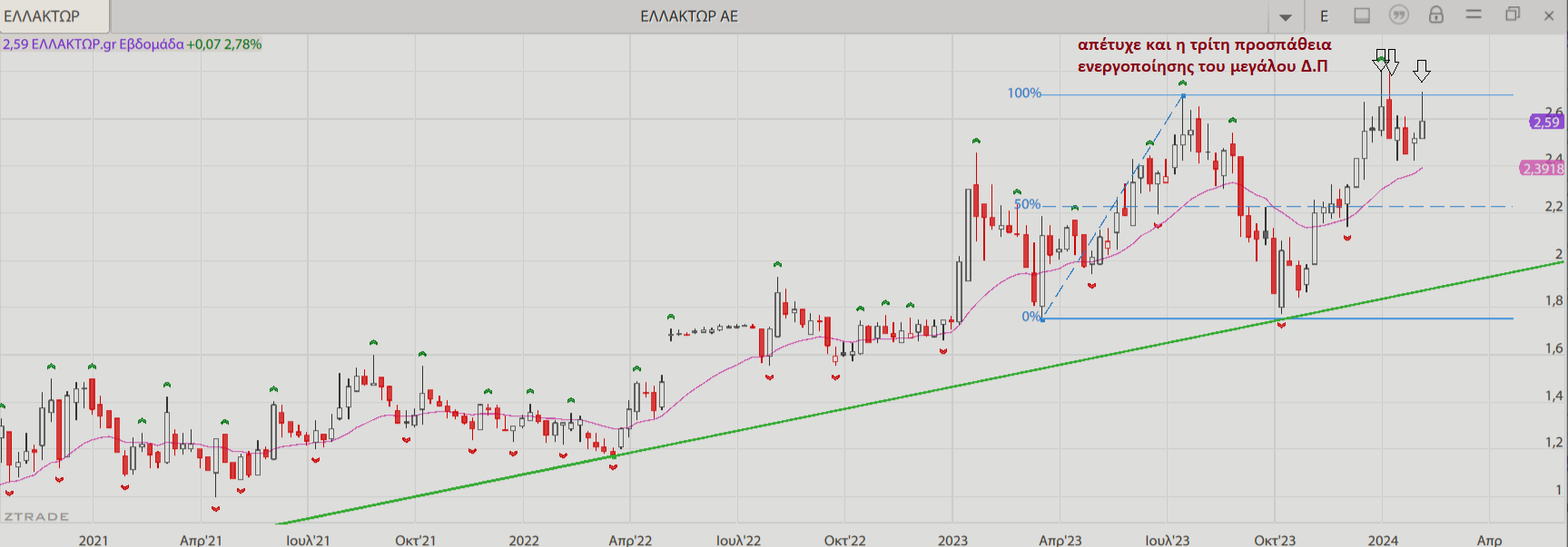 Άλλη μια εβδομάδα με νεότερα υψηλά κι όπως βλέπουμε στο μηνιαίο διάγραμμα του ΓΔ οι τιμές έφθασαν κάτι λιγότερο από 5% πριν το στόχο του ανοδικού τριγώνου και μια ανάσα πριν το υποτιθέμενο μεγάλο τρίτο κύμα της ανόδου από τα χαμηλά του 2020 γίνει διπλάσιο του επίσης υποτιθέμενου πρώτου κύματος, σύμφωνα πάντα με το βασικό σενάριο που έχω κατά νου. Στον RSI έχει γίνει πιο ξεκάθαρη η αρνητική απόκλιση σε σχέση με τα υψηλά του 2023 με το δείκτη στην υπεραγορασμένη ζώνη τιμών πάντως.