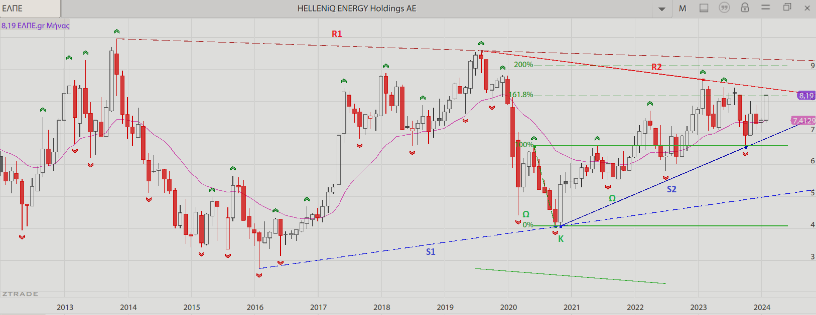 Σημαντική είναι η διαρκής βελτίωση της τεχνικής εικόνας των τιμών στα ΕΛΠΕ μετά τις διαδοχικές διασπάσεις των πρώτων κατερχόμενων γραμμών τάσης οπότε η προσδοκία είναι η διάσπαση και της επόμενης (R2), της προτελευταίας δηλαδή. Η τελευταία (R1) είναι λίγο ψηλότερα από το μέγιστο στόχο του μεγάλου ανάστροφου ΩΚΩ η γραμμή λαιμού του οποίου στα 6,60 ευρώ έδωσε στήριξη στην τελευταία βουτιά του Οκτωβρίου.