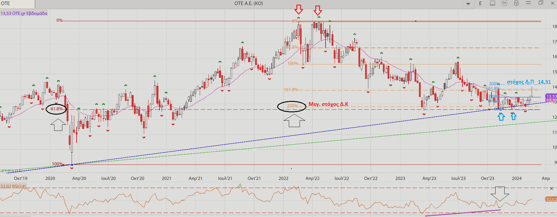 Πολλή κουβέντα εσχάτως για τον ΟΤΕ, ευλόγως αφού η μετοχή υποαποδίδει σε σχέση με την αγορά σχεδόν δυο χρόνια, έχοντας πάντως βρει μια βάση σε περιοχή που συμπίπτουν σημαντικά τεχνικά επίπεδα όπως είναι το 61,8% διόρθωσης όλου του ανοδικού από τα χαμηλά της πανδημίας, ο μέγιστος στόχος του σχηματισμού διπλής κορυφής του 2022 και η πιο σημαντική γραμμή τάσης στη μεγάλη εικόνα η S, στην οποία πατάει στα τελευταία 4 μηνιαία κεριά. Αυτά θα τα θυμηθούμε στα διαγράμματα που ακολουθούν. Η θετική απόκλιση του εβδομαδιαίου RSI ενισχύει την πιθανότητα να έχουμε δει σημαντικό πάτο.