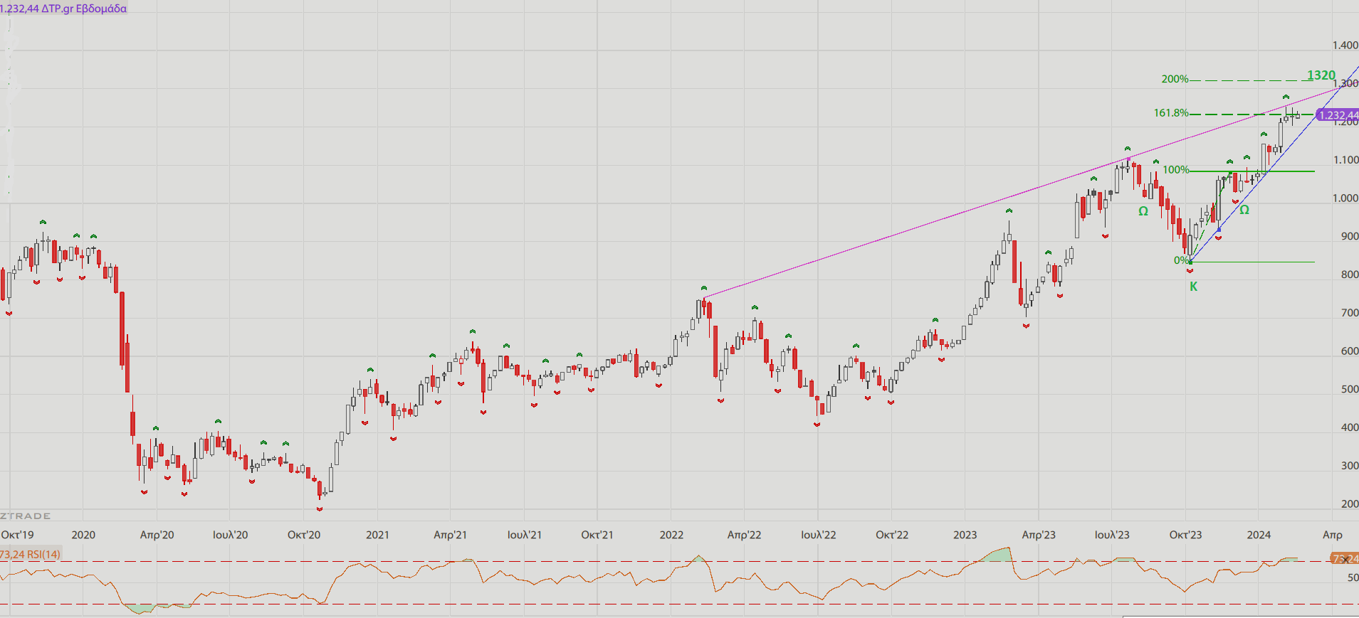 Ο μηνιαίος RSI 14 έχει εισέλθει στην υπεραγορασμένη ζώνη τιμών με φυσιολογική (κατά την άποψή μου) αρνητική απόκλιση σε σχέση με τα υψηλά του 2023 όπου η κίνηση των τιμών ήταν 570 μονάδες, ενώ η κίνηση από τα χαμηλά του Οκτωβρίου είναι 343 μονάδες (~40% μικρότερη).