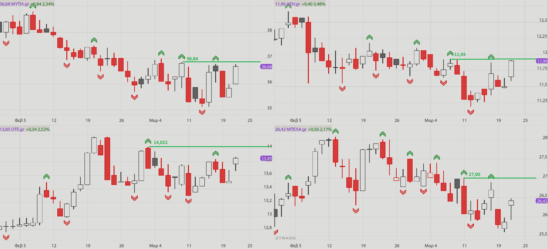 … και τους ΜΥΤΙΛ, ΔΕΗ, ΟΤΕ και JUMBO οι οποίες με ανοδικό χάσμα επίσης να έχουν πλησιάσει πολύ τις οριζόντιες αντιστάσεις τους που σημειώνονται στα διαγράμματα κι αν καταφέρουν να τις διασπάσουν θα έχουν μετά από καιρό ένδειξη για ανοδική αλλαγή τάσης στο ημερήσιο. Μαζί με τις ΜΟΗ και ΕΛΠΕ είχαν την υψηλότερη απόδοση από τα βαριά χαρτιά παίρνοντας τη σκυτάλη από τις ΕΤΕ κυρίως αλλά και την ΠΕΙΡ που είπαν να ξεκουραστούν μετά την εντυπωσιακή κίνησή τους την Τετάρτη.