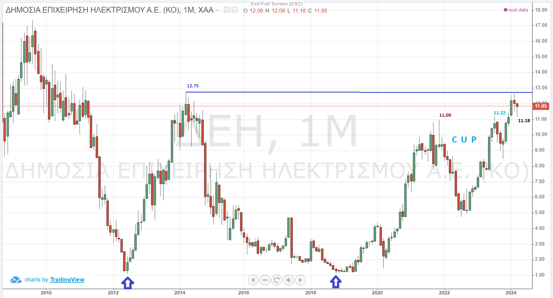 Παρά τις μεγάλες κάτω σκιές στα δυο τελευταία μηνιαία κεριά πάμε για δεύτερο διαδοχικό αρνητικό κλείσιμο μήνα αν κλείσει ο μήνας κάτω από τα 12,06 ευρώ αλλά ο μηνιαίος TSI παραμένει με ξεκάθαρα ανοδική ένδειξη. Ο μεγάλος σχηματισμός του διπλού πυθμένα του 2012 και 2018 θα χρειαστεί περισσότερο χρόνο για ενεργοποιηθεί. Στο χαμηλό του μήνα είχαμε ουσιαστικά επιτυχές retest της γραμμής λαιμού του τελευταίου σχηματισμού CUP & HANDLE που παραμένει ενεργοποιημένος.