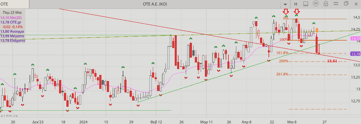 Αντίθετα η ταλαιπωρία συνεχίζεται στον ΟΤΕ όπου είχαμε επιστροφή σε καθοδική τάση με ενεργοποίηση του μίνι σχηματισμού διπλής κορυφής (Δ.Κ) τσεκάροντας ακόμη μια φορά την κατερχόμενη γραμμή τάσης που είχε διασπάσει ανοδικά. Ο ανάστροφος ΩΚΩ είναι απενεργοποιημένος όσο οι τιμές βρίσκονται κάτω από τα 14,17 ευρώ.