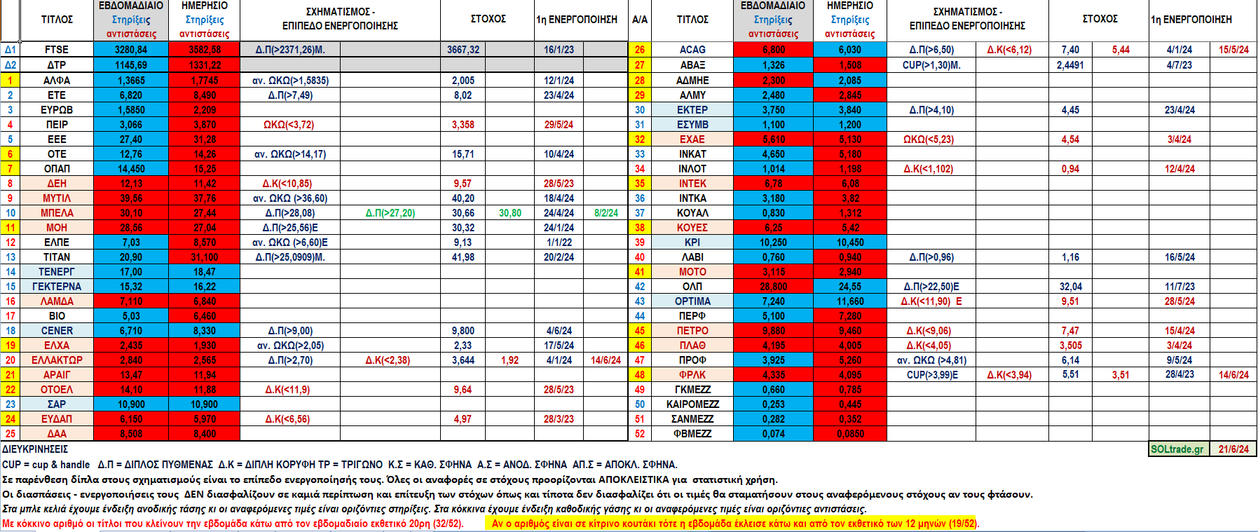 Στο επικαιροποιημένο πινακάκι στο οποίο έχει εισαχθεί ειδική ένδειξη για τους τίτλους που κλείνουν την εβδομάδα κάτω από τον εκθετικό κινητό των 12 μηνών, το κόκκινο παραμένει απόλυτα κυρίαρχο στην ημερήσια τάση ενώ υπάρχουν αρκετές αρνητικές ενδείξεις και στη μεγαλύτερη εικόνα όπου ακόμα κυριαρχεί το μπλε.