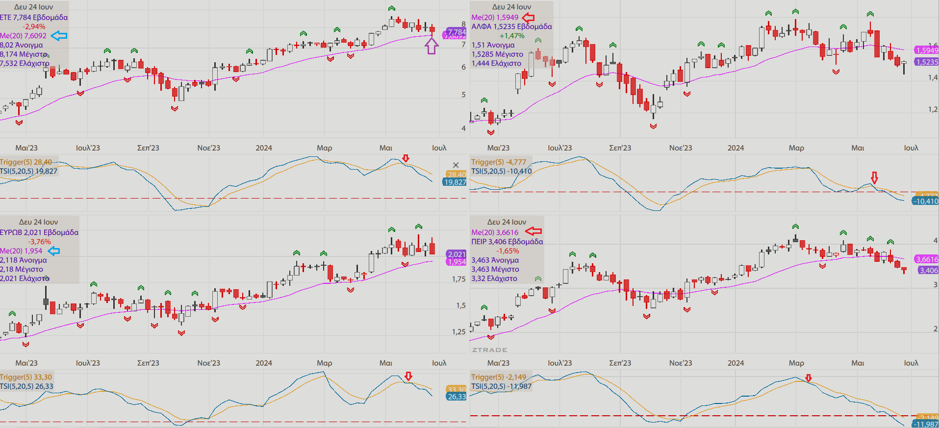 Στο εβδομαδιαίο ΑΛΦΑ και ΠΕΙΡ έχουν σταθεροποιηθεί χαμηλότερα του ΕΚΜΟ 20Ε στον οποίο βρήκε στήριξη η ΕΤΕ ενώ και οι 4 έχουν αρνητική ένδειξη από τον TSI εδώ και καιρό.