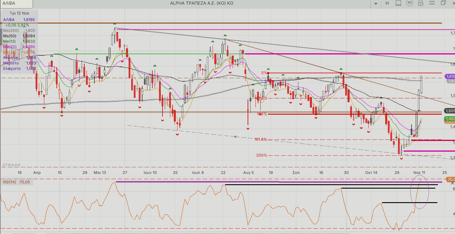 Η ΑΛΦΑ που παρακολουθούμε βήμα βήμα στις τελευταίες αναρτήσεις είναι ίσως η μετοχή που πρωταγωνίστησε σε αυτήν κίνηση και χθες έφθασε μια ανάσα από τη δική της οριζόντια αντίσταση στα 1,63 με τον RSI να έχει ξεπεράσει σε αντίθεση με τις τιμές όλα τα υψηλά των τελευταίων 9 μηνών και ήδη η πρώτη υποψία για κρυφή αρνητική απόκλιση ακυρώθηκε μετά και τη χθεσινή άνοδο που συνοδεύτηκε από ισχυρή αύξηση της συναλλακτικής δραστηριότητας. Αν βρει τη δύναμη να συνεχίσει τη σημαντική της αντίδραση θα ακυρώσει και την επόμενη από τις πιθανές κρυφές αποκλίσεις που βλέπουμε στο διάγραμμα. Οι τιμές της μετοχής πέρασαν χθες πάνω από τον απλό 200ρη μετά από ενάμιση μήνα