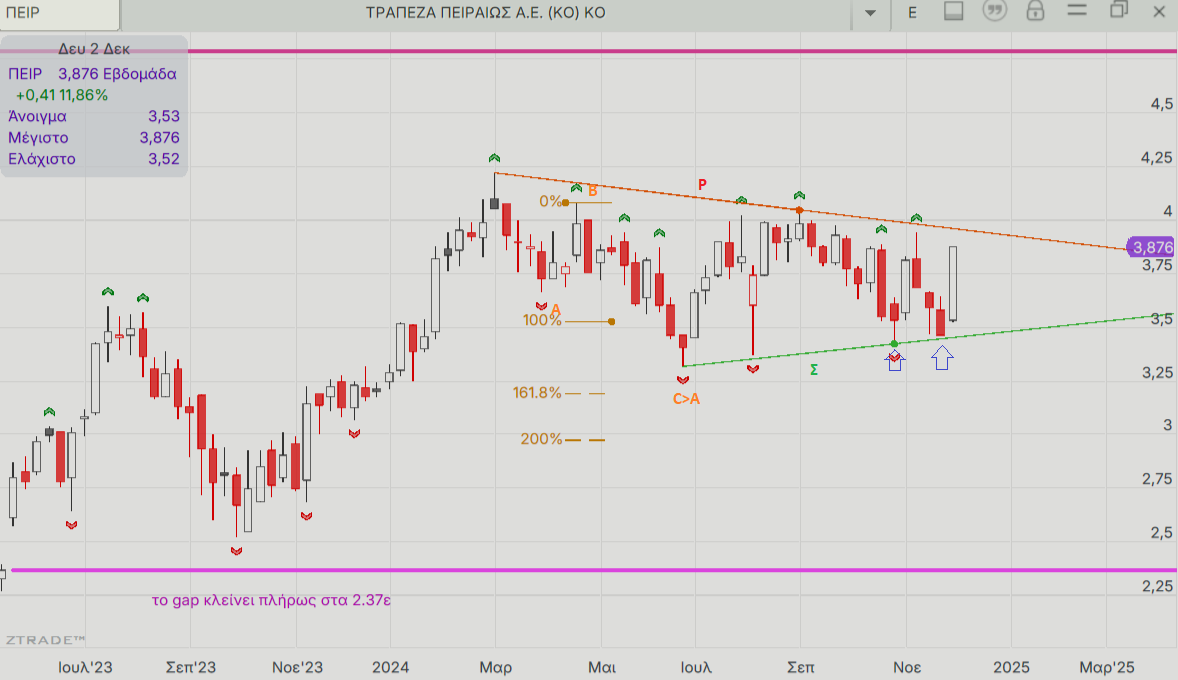 Από τον πρωταγωνιστή κλάδο της αντίδρασης θα δούμε ξανά την ΠΕΙΡ της οποίας το διάγραμμα μοιάζει περισσότερο με αυτό του ΔΤΡ στην απόδοση του οποίου συνεισέφεραν και οι 4 μεγάλες τράπεζες εξ’ ίσου. Οι τιμές έφθασαν στο στόχο του μικρού σχηματισμού διπλού πυθμένα και απέχουν ελάχιστα από την διάσπαση των 3,94 ευρώ οπότε ενεργοποιείται και ο μεγαλύτερος διπλός πυθμένας με φιλόδοξους στόχους ακόμα και πάνω από τα 4,40 ευρώ.