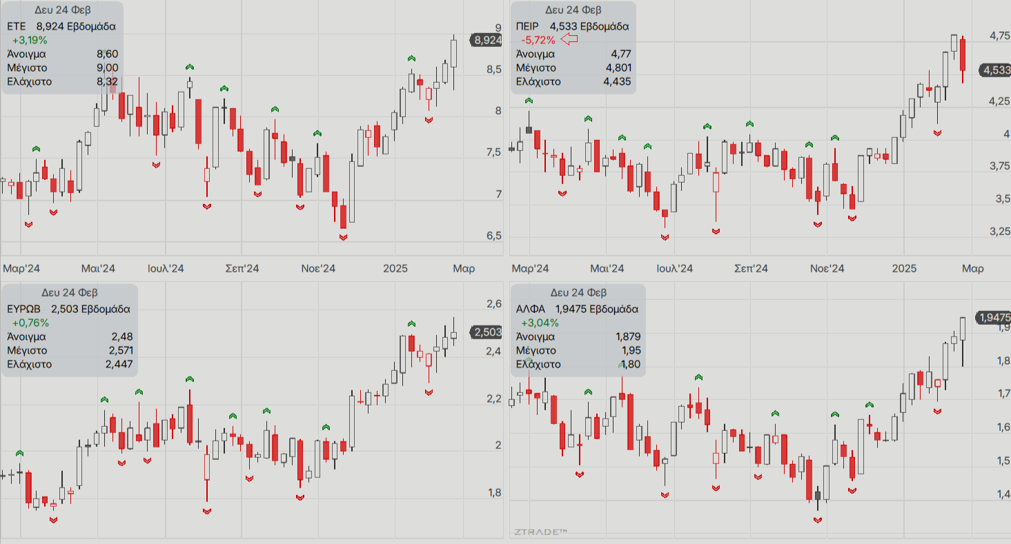 Στο επικαιροποιημένο πινακάκι συνοπτικής απεικόνισης όπου αποτυπώνεται η εικόνα των τίτλων με το μεγαλύτερο ενδιαφέρον βλέπουμε μεταξύ άλλων και την απόδοση που έχουν οι τίτλοι κι οι δείκτες το πρώτο δίμηνο του 2025. Τα κριτήρια της τάσης είναι οι τιμές των μετοχών ως προς τις αντιστάσεις και τις στηρίξεις από τα τα fractals αλλά και ως προς τους εκθετικούς κινητούς μέσους όρους (ΕΚΜΟ) των 200 συνεδριάσεων και των 20 εβδομαδιαίων κλεισιμάτων σύμφωνα με τις σημειώσεις. Μπορούμε επίσης να δούμε και τους σχηματισμούς και τα επίπεδα ενεργοποίησής τους καθώς και τους τελικούς στόχους τους. Η συνολική εικόνα είναι σαφώς θετική για τους τίτλους με τις μεγαλύτερες κεφαλαιοποιήσεις και μοιρασμένη στους υπόλοιπους.
