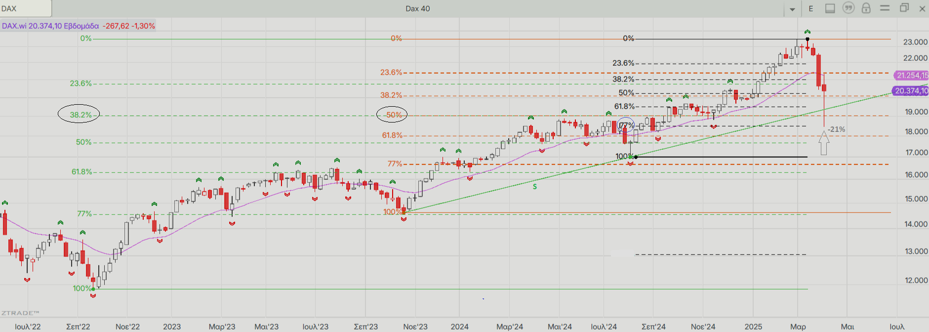 Με τις αγορές να άγονται και να φέρονται από τις κυβιστήσεις του maga δεν ξέρω πόσο νόημα έχει να ψάξει κανείς για τεχνικά σημεία προκειμένου να εντοπίσει τοπικούς έστω πυθμένες, εν τούτοις στα εβδομαδιαία διαγράμματα των Ελληνικών και ξένων δεικτών που ακολουθούν μπορούμε να διακρίνουμε λόγους για τους οποίους τα πρόσφατα χαμηλά μπορεί και να αποτελούν τον πυθμένα προσωρινά τουλάχιστον. Σε όλα έχουν σημειωθεί εκτός των τεχνικών σημείων ή επιπέδων και οι απώλειες από τα ιστορικά υψηλά τους που κατέγραφαν στα χαμηλά της προηγούμενης εβδομάδας.
