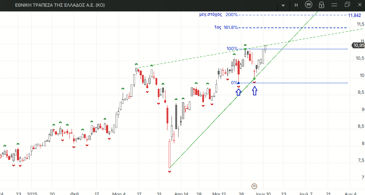 Το υπόλοιπο που έχει να διανύσει η ΕΤΕ ως τον μέγιστο στόχο του τελευταίου διπλού πυθμένα της στα ψηλά εκτιμάται ότι είναι αρκετό για να παρασύρει και τις τιμές των άλλων τραπεζών ψηλότερα και βέβαια τις τιμές του δείκτη προς το στόχο του σχηματισμού.