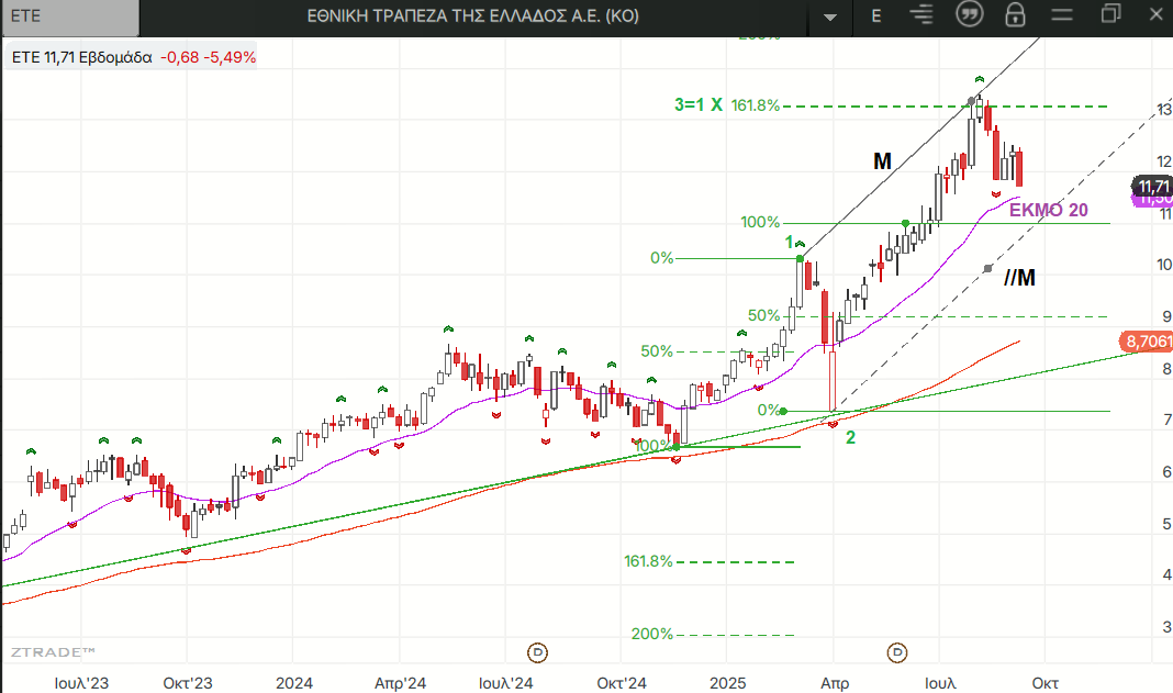 Όπως είδαμε στις τελευταιες αναρτήσεις τα σκαμπανεβάσματα των τιμών από το επίπεδο διάσπασης του τελευταίου τριγώνου ως τον 1ο στόχο του σχηματισμού διπλού πυθμένα της Άνοιξης έχουν δημιουργήσει δυο νέα εβδομαδιαία low fractals και έτσι η μεσοπρόθεσμη οριζόντια στήριξη έχει ανέβει πλέον στα 13,77 ευρώ κάτω από τα οποία ενεργοποιείται και σχηματισμός διπλής κορυφής. Το σενάριο να βλέπουμε τον αντίθετο σχηματισμό διπλού πυθμένα ισχύει ακόμα βέβαια και ο στόχος της μίνι διπλής κορυφής στα 13,76 ευρώ δεν έχει πιαστεί πλήρως. Οι μεσομακροπρόθεσμοι σχηματισμοί βέβαια έχουν ως γνωστόν στόχους σε πολύ υψηλότερα επίπεδα. Στα 14,46 ευρώ είναι η πλησιέστερη οριζόντια αντίσταση παραβίαση της οποίας κάνει πιθανότερο το θετικό σενάριο για τη μεσοβραχυπρόθεσμη συνέχεια.