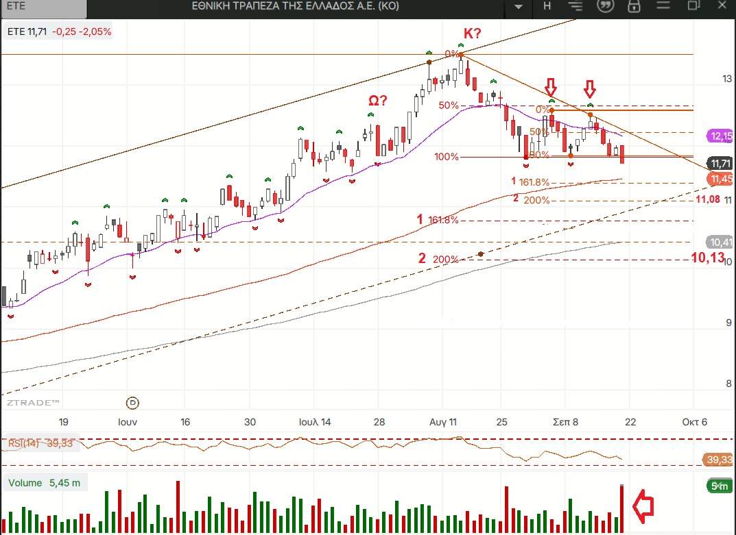 Το κλείσμο κάτω από το πλησιέστερο εβδομαδιαίο low fractal και η ενεργοποίηση της μίνι διπλής κορυφής επιβεβαιώνει την αλλαγή της βραχυπρόθεσμης τάσης και θέτει στόχο τα 11,08 ευρώ για να μην υπολογίσουμε από τώρα την περίπτωση να έχει ενεργοποιηθεί και ο πιθανός ΩΚΩ που βλέπουμε στο ημερήσιο…