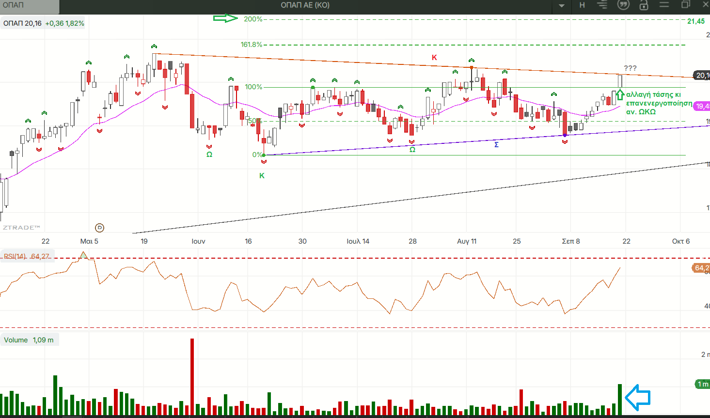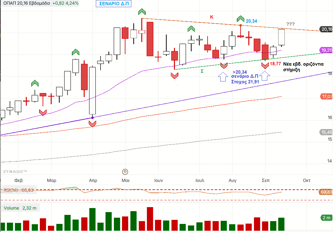 Πέτυχε μια από τις καλύτερες εβομαδιαίες αποδόσεις με όγκο και συνετέλεσε αποφασιστικά στη συγκράτηση των απωλειών των δεικτών κόντρα στις τράπεζες. Είχε σημαντικές μεταβολές με την εβδομαδιαία οριζόντια στήριξη να ανεβαίνει στο τελευταίο τοπικό χαμηλό αλλά και παραβίαση του υψηλότερου απο τα δυο τελευταία τοπικά υψηλά του ημερήσιου που αποτελεί ένδειξη ανοδικής τάσης. Οι τιμές επανενεργοποίησαν τον ανάστροφο ΩΚΩ τους κι αν καταφέρουν να διασπάσουν το τρίγωνο πάνε και για ενεργοποίηση ανοδικού σχηματισμού θέτοντας στόχους στην περιοχή των 22 ευρώ.