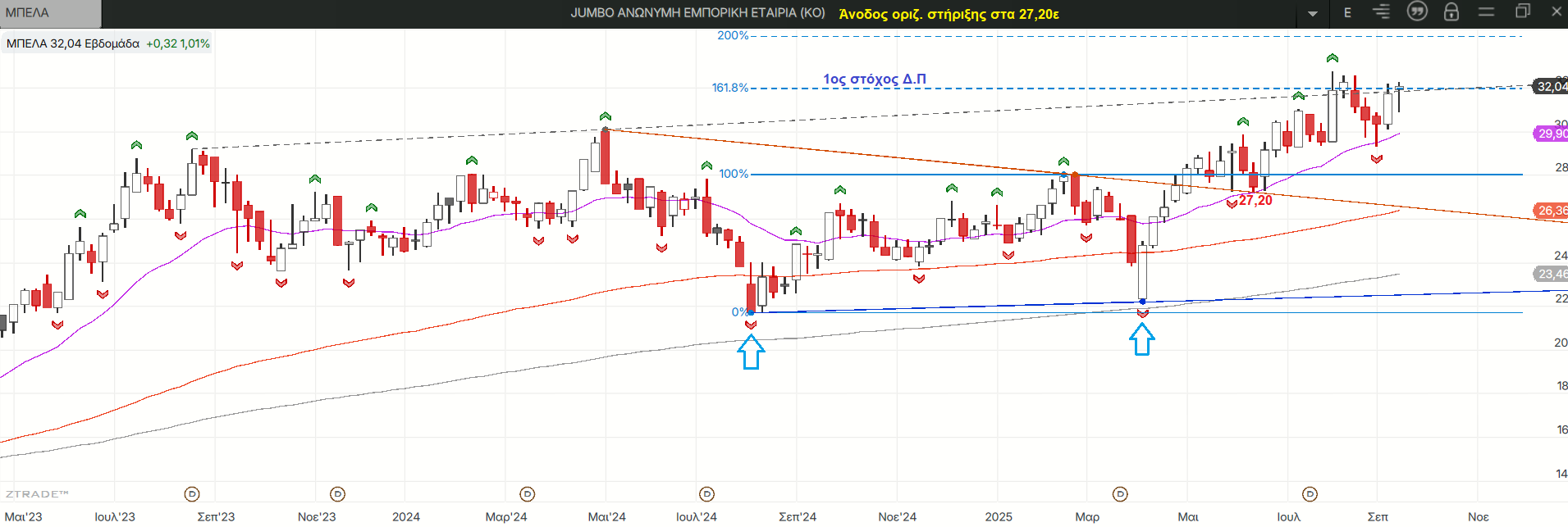 Η μεσοπρόθεσμη οριζόντια στήριξη ανέβηκε κι εδώ μετά την ολοκλήρωση του σχηματισμού του τελευταίου εβδομαδιαίου low fractal αλλά οι τιμές είναι πολύ υψηλότερα αφού παίζουν και πάλι στον 1ο στόχο του διπλού πυθμένα (Δ.Π) τους και μοιάζουν έτοιμες για νέο ιστορικό υψηλό δεδομένων των μέγιστων στόχων τόσο του Δ.Π όσο και της διάσπασης του τριγώνου. Οι διορθώσεις της ανοδικής κίνησης μετά τα χαμηλά του Απριλίου έφθασαν μέχρι τον εβδομαδιαίο 20ρη όπου σχηματίστηκαν τα δυο τελευταία τοπικά χαμηλά.