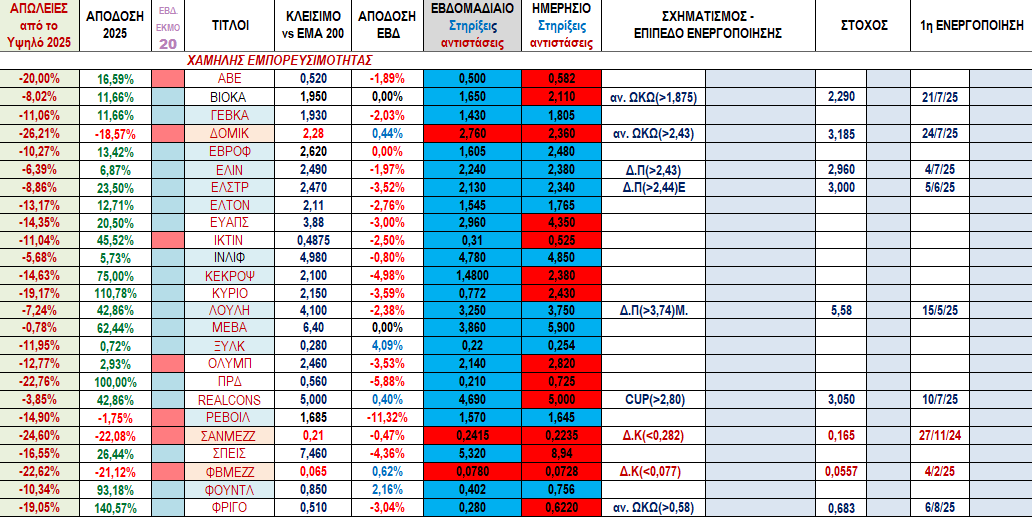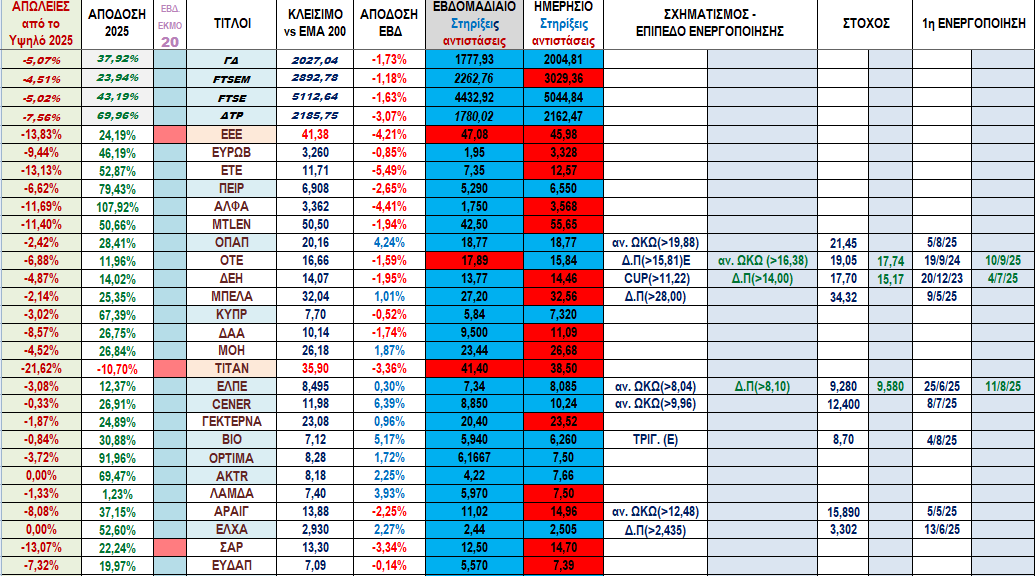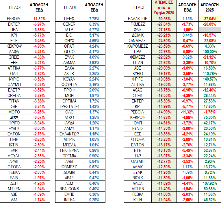 Στα πινακάκια της επόμενης λίστας μπορούμε να δούμε τους τίτλους με τη χειρότερ και την καλύτερη εβδομαδιαία απόδοση καθώς και αυτούς που έχουν τις μεγαλύτερες απώλειες από το υψηλό τους μέσα στο 2025.