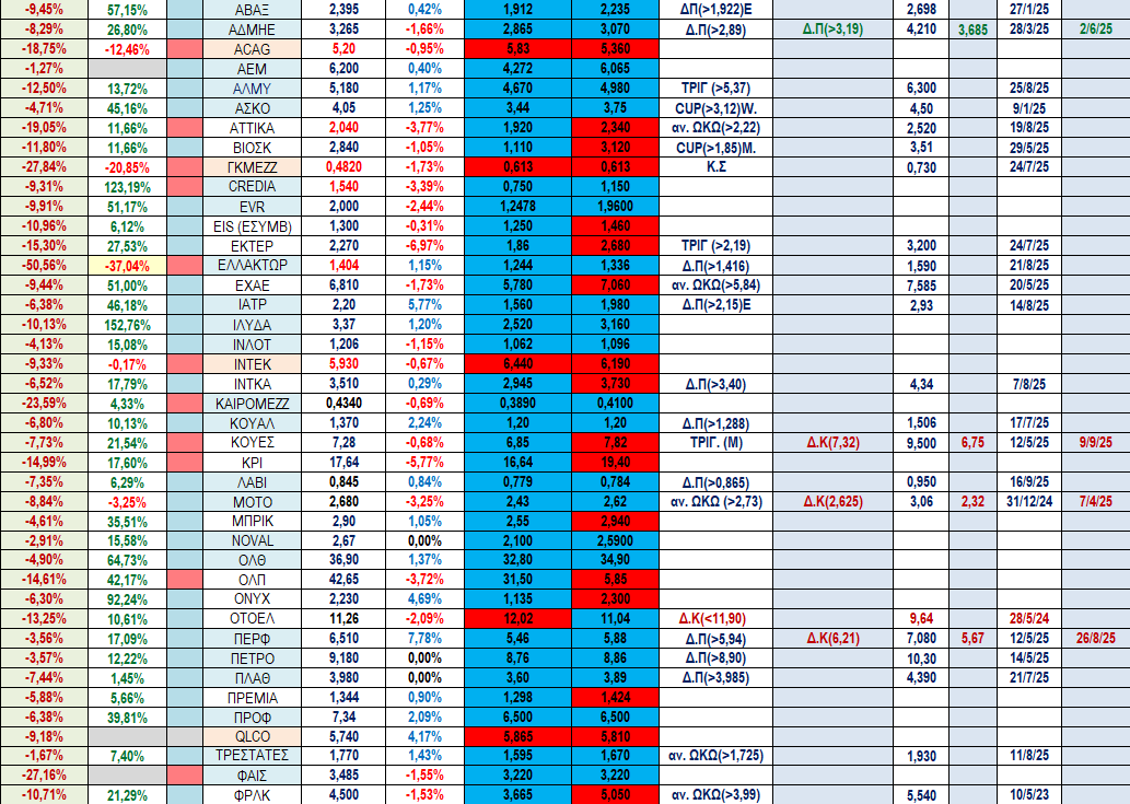Όπως θα δούμε στο πινακάκι συνοπτικής ανασκόπησης της τελευταίας συνεδρίασης οι μεγάλοι δείκτες δεν έχουν παραβιάσει ούτε την οριζόντια στήριξη του ημερήσιου, η οποία ανέβηκε επίσης (και πάλι) στο χαμηλό της 8/9/25 και οι απώλειές τους από το υψηλό του 2025 είναι μονοψήφιες ακόμα αν και οι περισσότεροι από τους μισούς από τους τίτλους που συμπεριλαμβάνονται σ’ αυτό έχουν παραβιάσει τη δική τους οριζόντια στήριξη επιβεβαιωμένα ή μη. Οι αρνητικές ενδείξεις έχουν φθασει και πάλι το 1/4 του συνόλου όπως και στο τέλος Αυγούστου. Κάποιες οριζόντιες στηρίξεις έχουν ανέβει σε υψηλότερα επίπεδα στο ημερήσιο (AKTR) ή στο εβδομαδιαίο (ΠΕΙΡ, CENER, BIO, ΕΛΧΑ) σε σχέση με την προηγούμενη Παρασκευή και το ίδιο ισχύει και για κάποιες αντιστάσεις που χαμήλωσαν στα χαρτιά που έχουν ήδη κοκκινίσει.