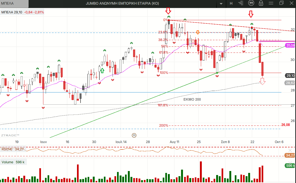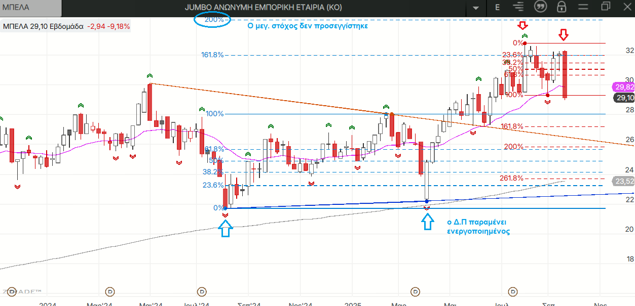 Η αρνητική έκπληξη της εβδομάδας (εκτός της MTLN που είδαμε επανηλειμένα τις τελευταίες μέρες) ήταν βέβαια η ΜΠΕΛΑ που με το τεράστιο κόκκινο κερί της ενεργοποίησε σχηματισμό διπλής κορυφής (Δ.Κ) που μπορεί θεωρητικά να την πάει αρκετά χαμηλότερα, έκλεισε κάτω από τον εβομαδιαίο 20ρη και πλησιάζει τον 200ρη της στο ημερήσιο! Ο μεγάλος διπλός πυθμένας (Δ.Π) της πάντως παραμένει ενεργοποιημένος κι από τους στόχους του, τους οποίους είδαμε και στο πινακάκι, έχει πιαστεί μόνο ο πρώτος.
