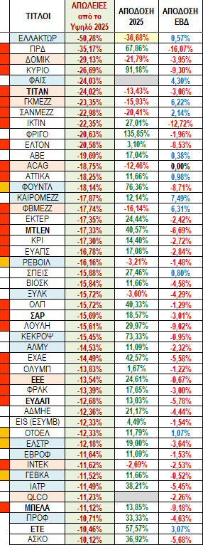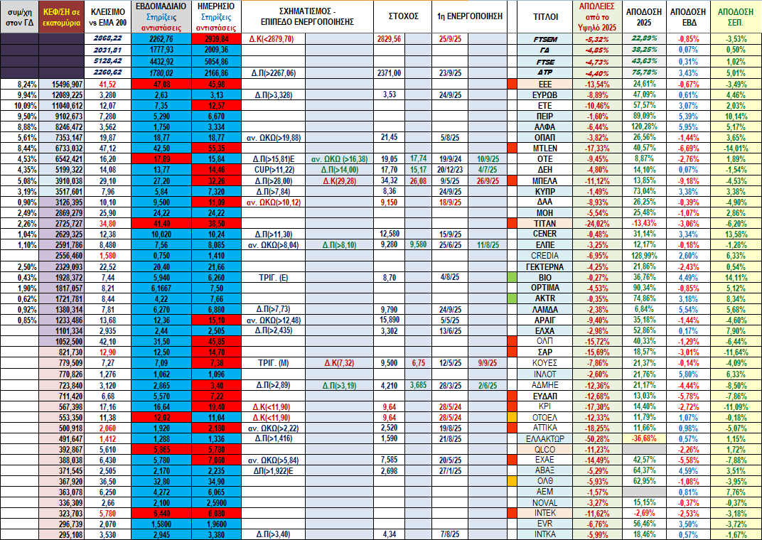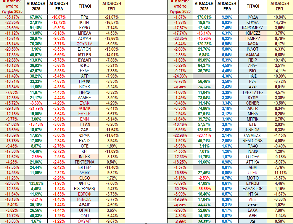 Στο πινακάκι συνοπτικής ανασκόπησης των 4 δεικτών και των 91 τίτλων που παρουσιάζονται κατά σειρά κεφαλαιοποίησης μπορούμε να δούμε τις εβδομαδιαίες αποδόσεις αλλά και αυτές όλου του 2025, του Σεπτεμβρίου που έχει ακόμα δυο συνεδριάσεις και κυρίως τις απώλειες του κάθε δείκτη ή τίλου από την υψηλότερη τιμή που είχε μέσα στο 2025.