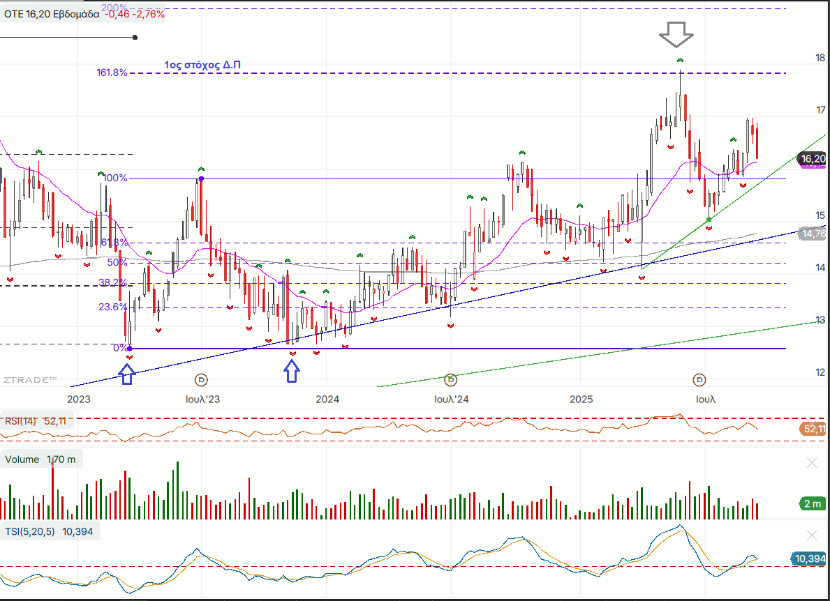 Άλλη μια εβδομάδα με έστω και οριακά θετικό πρόσημο για τους μεγάλους δείκτες της αγοράς χάρις στην καλή απόδοση των ΑΛΦΑ, ΠΕΙΡ, ΕΤΕ και ΚΥΠΡ που εξισσορόπησαν τις μεγάλες απώλειες της ΜΠΕΛΑ και της ΜΤLΝ κυρίως αλλά και των και των ΟΤΕ, ΤΙΤΑΝ και ΓΕΚΤΕΡΝΑ. Η εικόνα εκφράζεται πλήρως από τη σύγκριση τα εβομαδιαία κεριά του ΔΤΡ και του δείκτη υψηλής μερισματικής απόδοσης που διέσπασε το πλησιέστερο εβδομαδιαίο τοπικό χαμηλό του και πλησιάζει τον εβδομαδιαίο 2ορη.