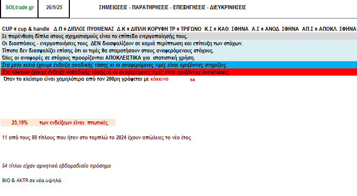 Αντίθετα οι τίτλοι με απώλειες μεγαλύτερες του 10% από το υψηλό έτους είναι 49 κι η πλειοψηφία τους είναι σε καθοδική τάση όπως δείχνει η κόκκινη σήμανση στην 1η στήλη. Με πορτοκαλί σήμανση είναι οι τίτλοι που είναι ακόμα σε ανοδική τάση αλλά οι τιμές τους είναι κοντά στην ορίζόντια στήριξή τους στο ημερήσιο.