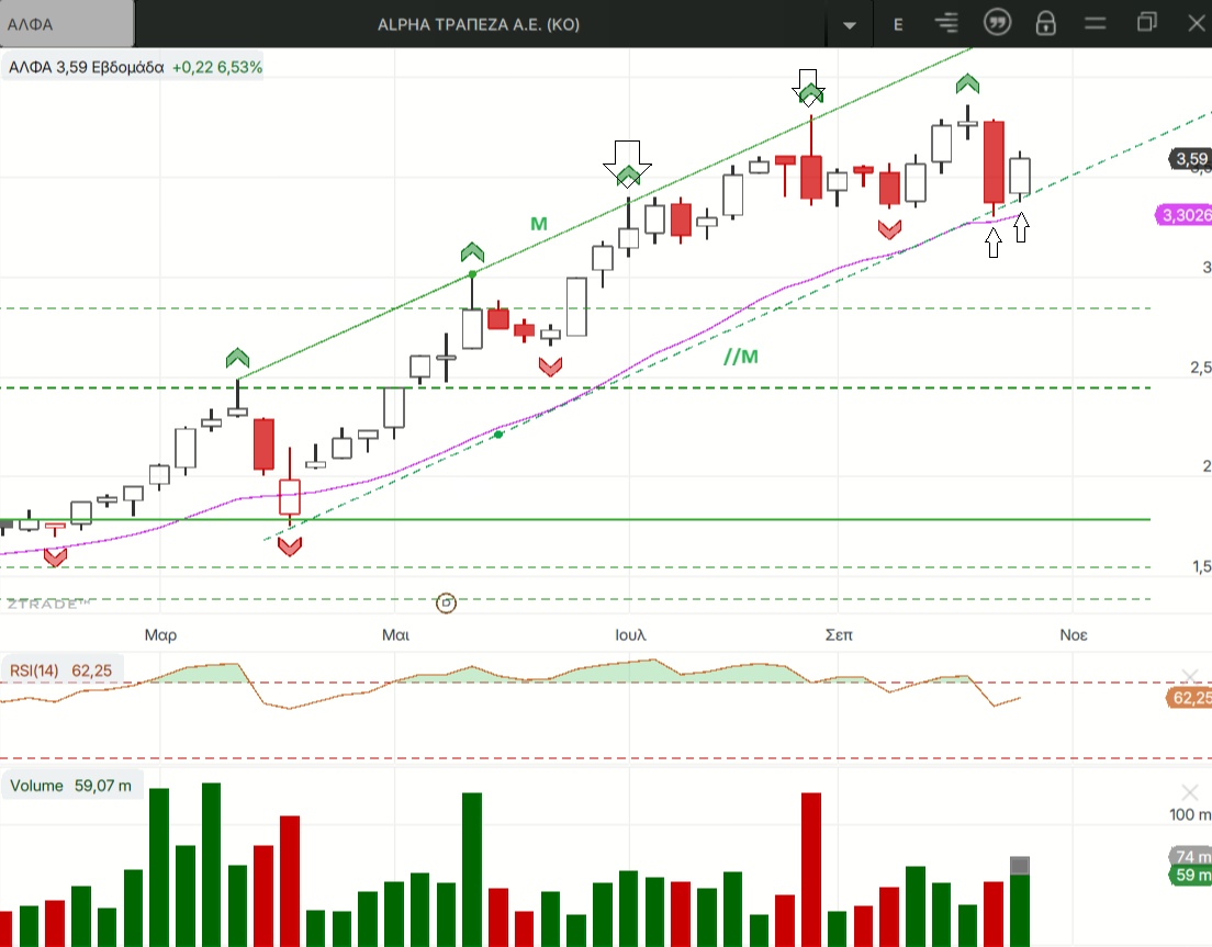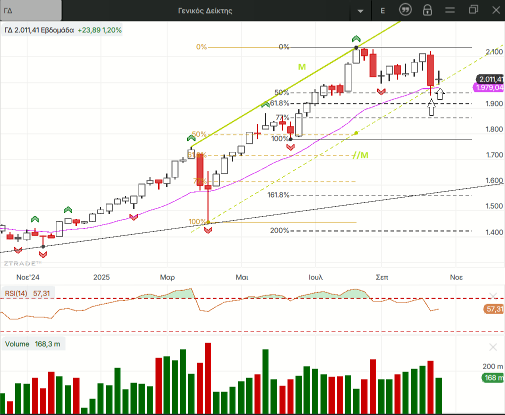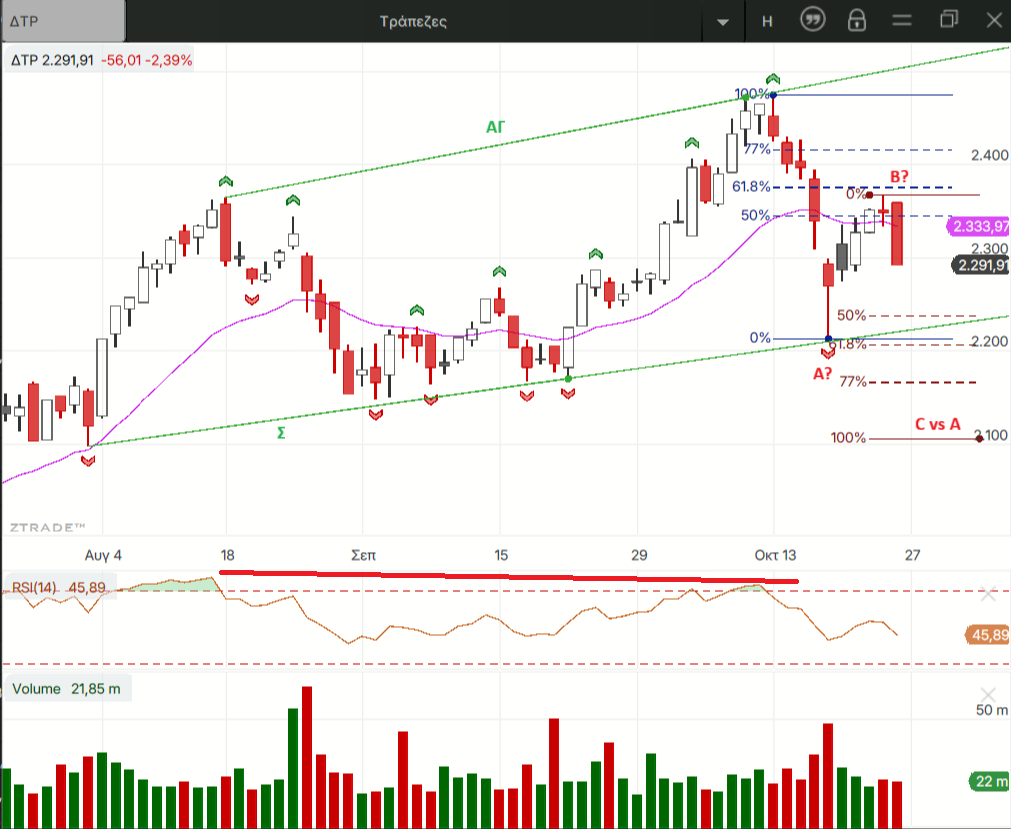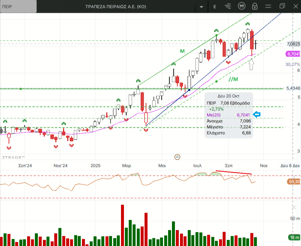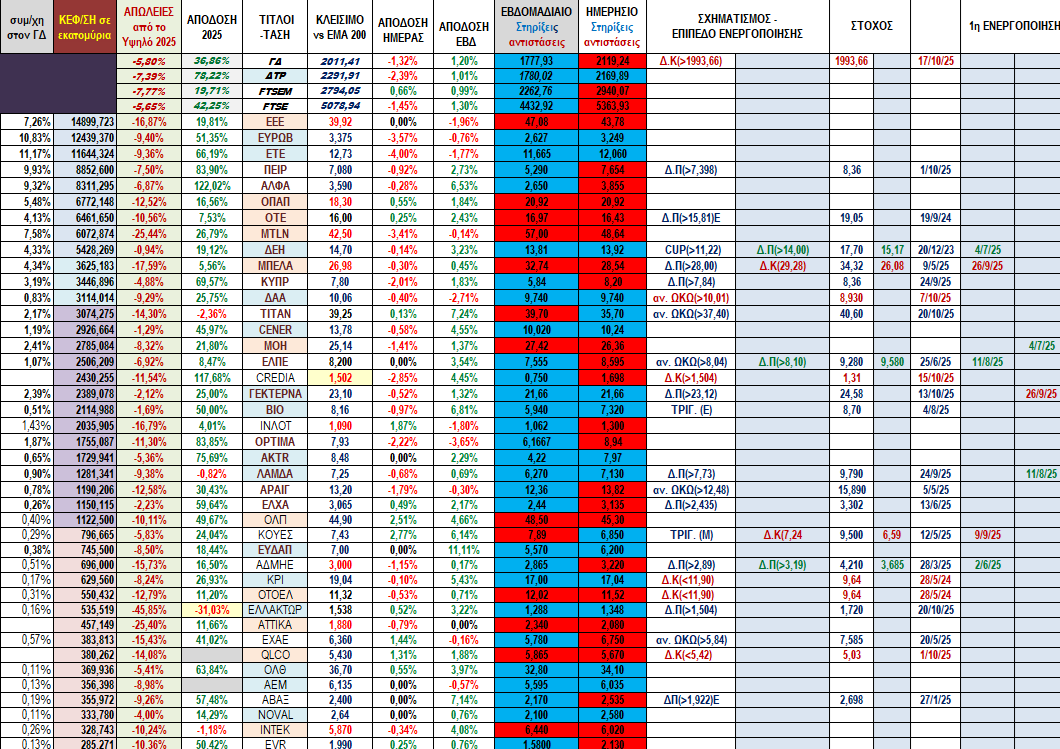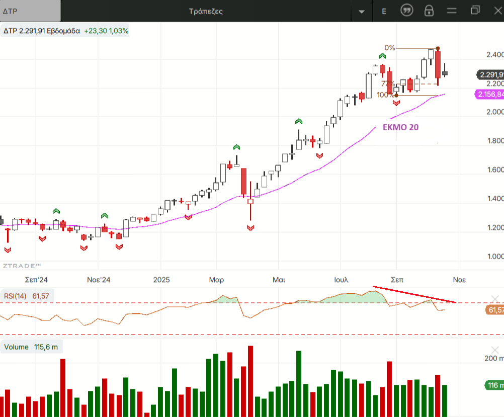 Εμείς εδώ από τον Αύγουστο κάνουμε ότι διορθώνουμε αλλά το μετανιώνουμε  και μάλιστα οι τράπεζες κάνουν και νέα υψηλότερα  υψηλά χωρίς όμως να αυτό να φαίνεται αρκετό να τραβήξουν ψηλότερα και τα υπόλοιπα βαριά χαρτιά του ΓΔ. Βέβαια φαίνεται λογικό με τα ποσοστά κερδών που καταγράφουν μέσα στο 2025, ειδικά οι τράπεζες δεν τους έχουν απομείνει μεγάλα ανοδικά περιθώρια στο 5ο συνεχόμενο ανοδικό έτος της αγοράς. Στην τελευταία συνεδρίαση της εβδομάδας οι πιέσεις επικεντρώθηκαν σε 3 από τους 10 τίτλους που διαμορφώνουν τον ΓΔ κατά 75% σχεδόν. Την MTLN για την οποία έχουν ανέβει ένα σωρό διαγράμματα κι εκτιμήσεις αφού είναι το κύριο θέμα δυο εβδομάδες τώρα αλλά και τις ΕΤΕ κι ΕΥΡΩΒ τις μοναδικές τράπεζες στις οποίες δεν έχουν παραβιαστεί ακόμα τα χαμηλότερα των δυο τελευταίων τοπικών χαμηλών τους στο ημερήσιο.