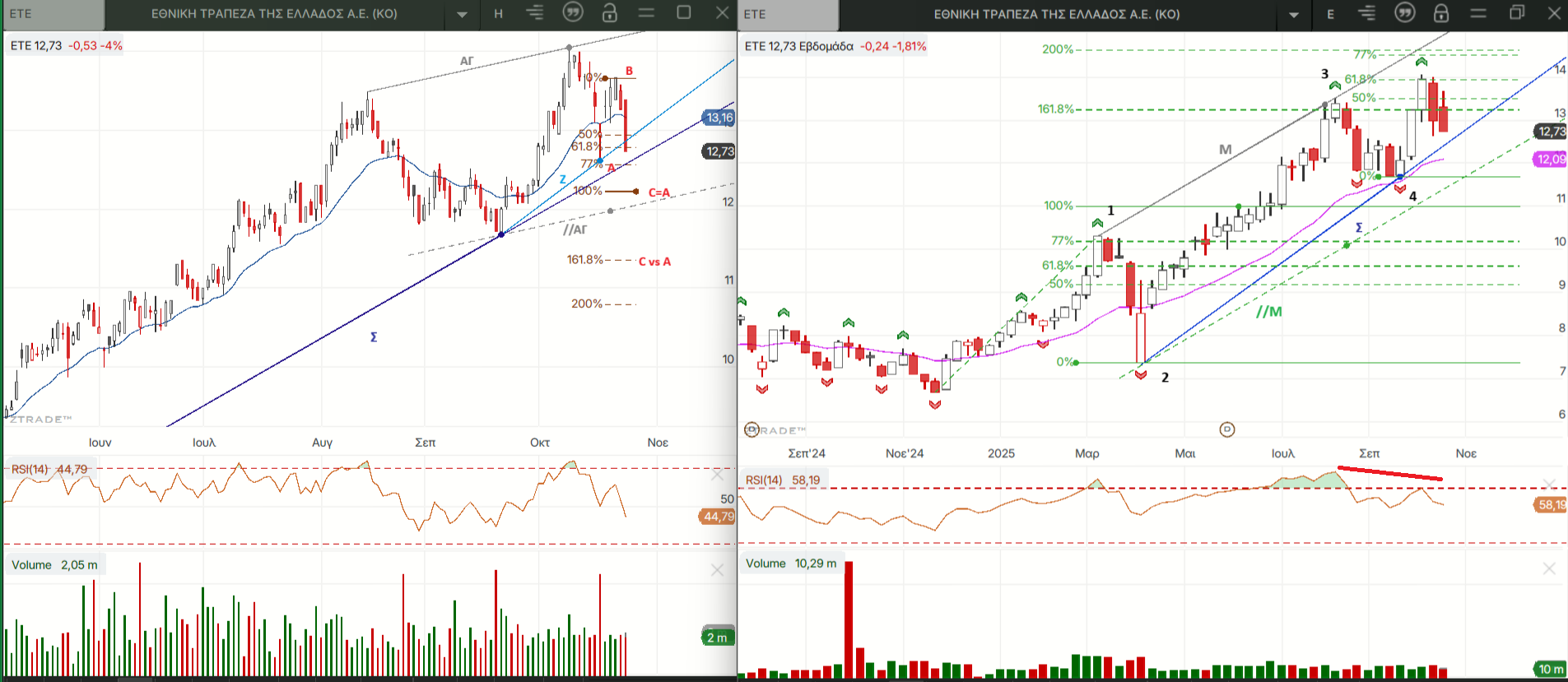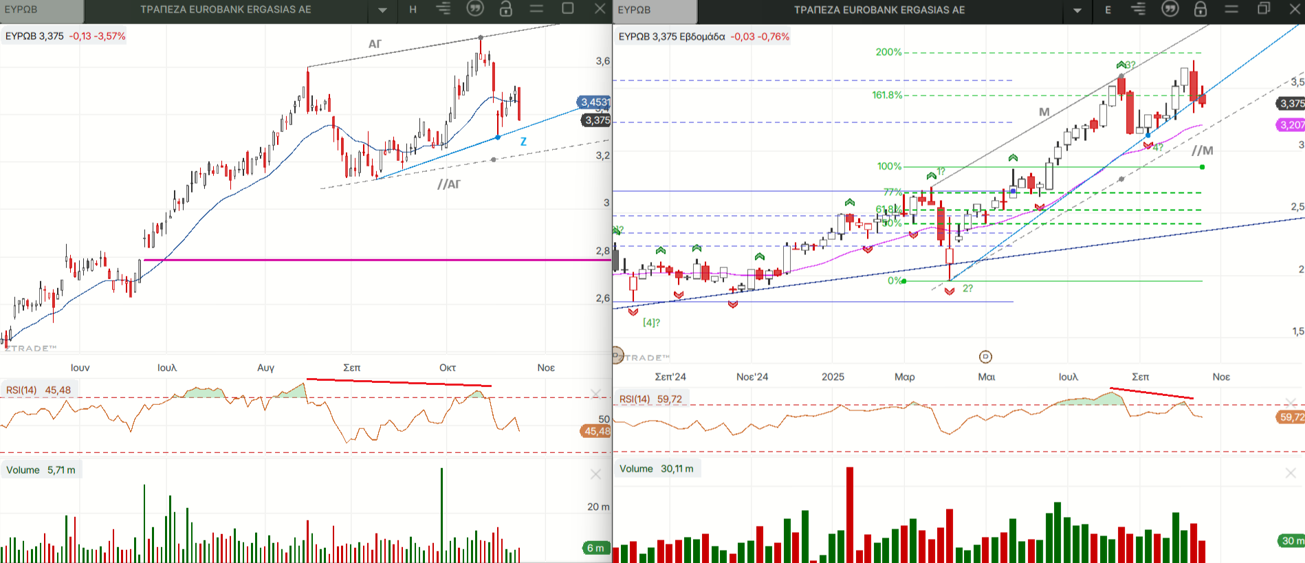 Και στους δυο πάντως η διόρθωση των τελευταίων συνεδριάσεων έρχεται μετά από αρνητικές αποκλίσεις του RSI τους ψηλά στην υπεραγορασμένη ζώνη τιμών.