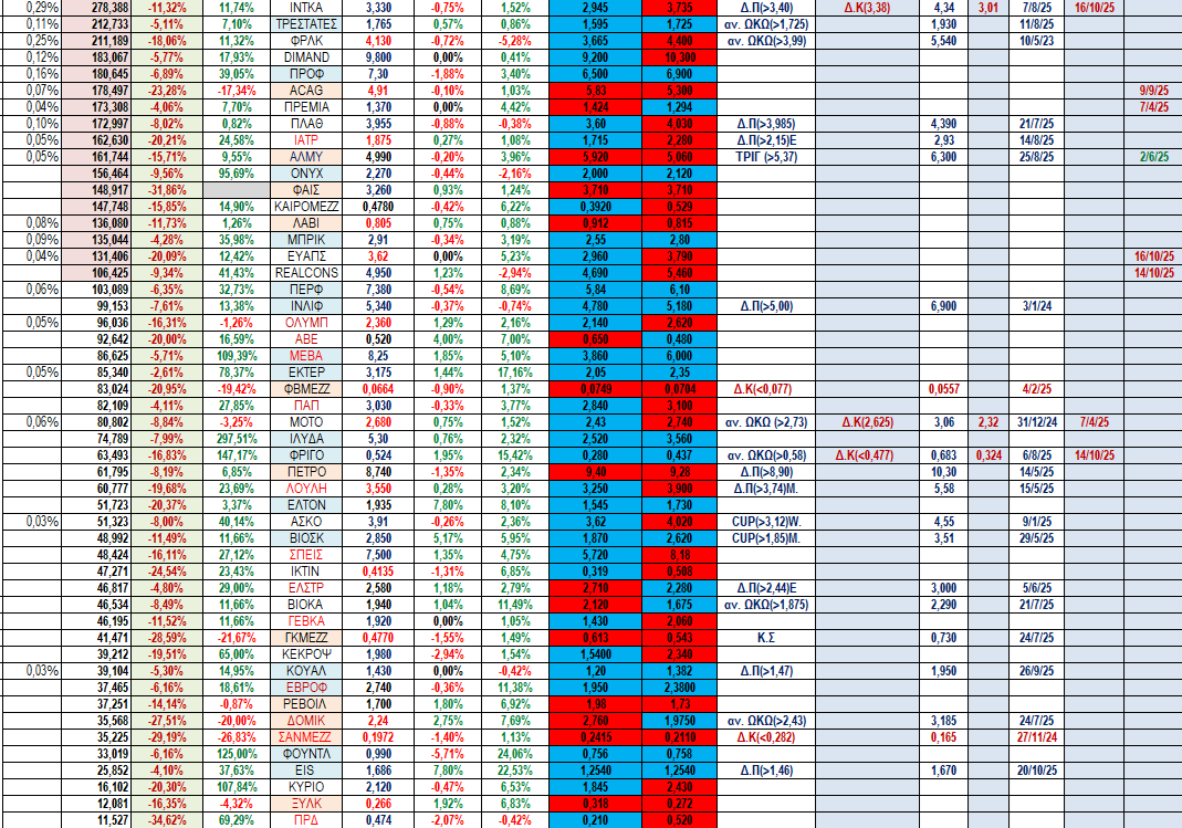 Θετικό ήταν και το ισοζύγιο στις ΔΕΗ και ΟΤΕ, ΟΠΑΠ ενώ εξαιρετική απόδοση είχαν η ΤΙΤΑΝ κι η CENER από τις λίγο μικρότερες κεφαλαιοποιήσεις όπως θα δούμε στο πινακάκι συνοπτικής απεικόνισης των 4 δεικτών και των 91 τίλων που ακολουθούν με σειρά κεφαλαιοποίησης αυτή τη φορά.