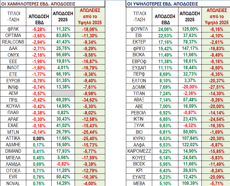 Οι αποδόσεις που ξεχώρισαν θετικά κι αρνητικά αυτή την εβδομάδα είναι στο πινακάκι που ακολουθεί στο οποίο βλέπουμε ότι στις μετοχές που ξεχώρισαν βρίσκονται μόνο 3 από το δείκτη μεγάλης κεφαλαιοποίησης ενώ οι υπόλοιπες είναι από τη μεσαία και τη μικρότερη κυρίως κεφαλαιοποίηση