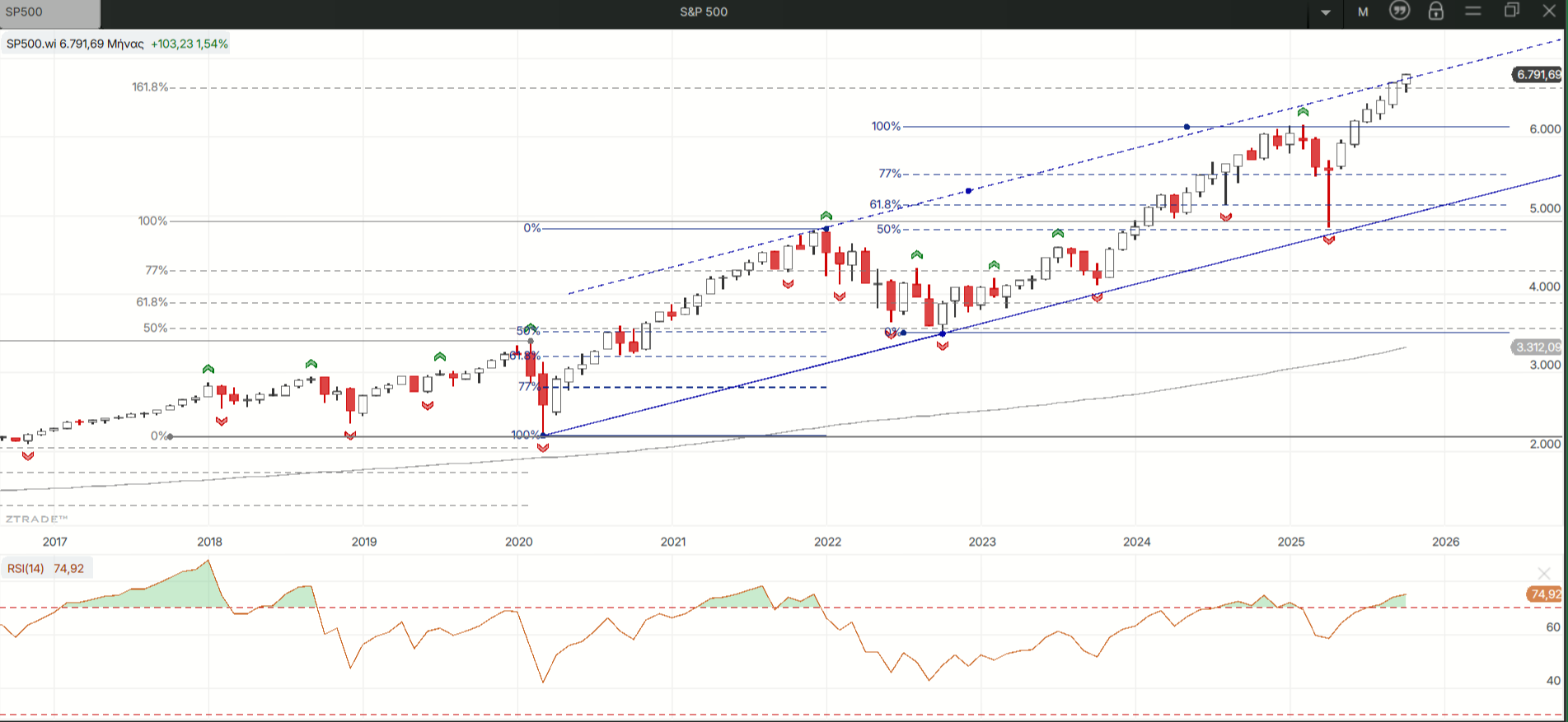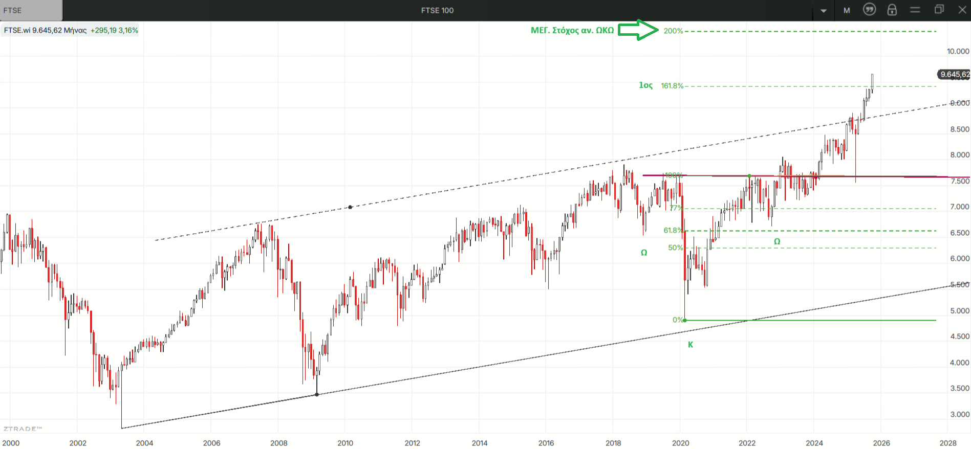 Έξω καλά πάμε. Και  οι 3 μεγάλοι δείκτες στις ΗΠΑ έκαναν την Παρασκευή νέα ιστορικά υψηλά, με τον SP 500 να διασπά ανοδικά ένα ακόμα ανοδικό κανάλι του παρά τα όσα καμπανάκια χτυπούν ολόγυρα και δεν είναι μόνο αυτοί. Εκτός από τον CAC 40 νέα ιστορικά υψηλά είχαμε αυτή η εβδομάδα και για τον FTSE 100 που πέρασε τον 1ο στόχο του μεγάλου μακροπρόθεσμου ανάστροφου ΩΚΩ του!