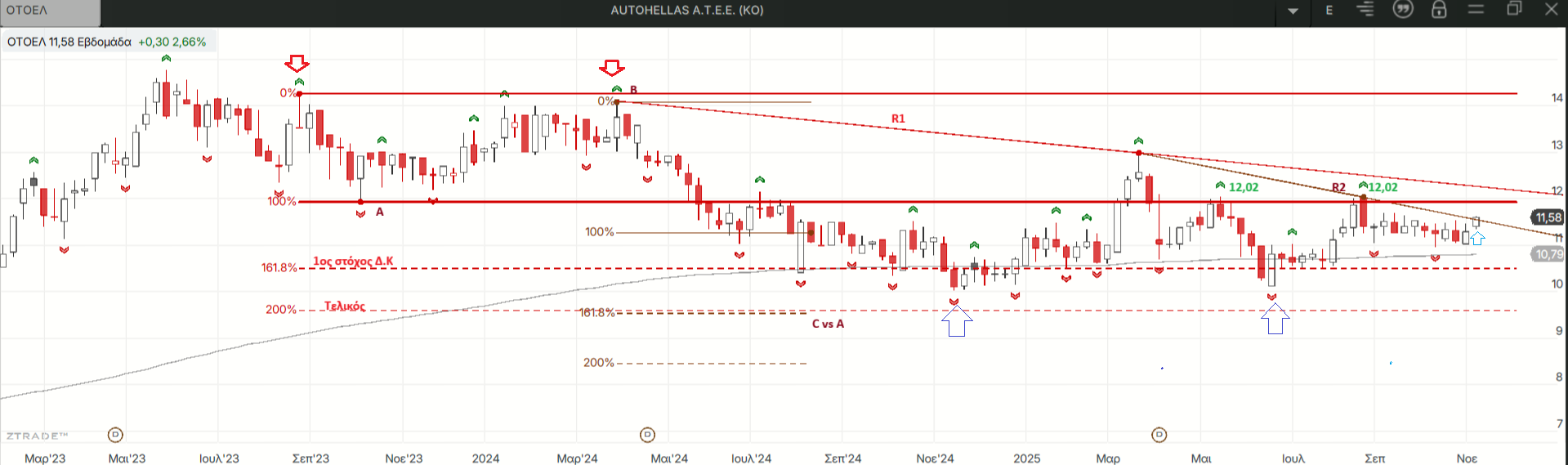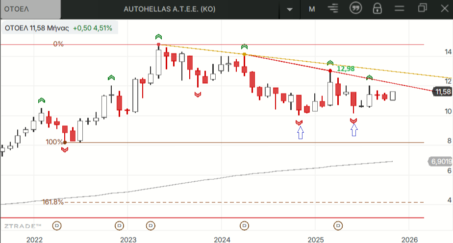 Οι τιμές βρίσκονται σε διόρθωση από τα ψηλά του 2023 χωρίς να φθάσουν τον τελικό στόχο του μεγάλου σχηματισμού διπλής κορυφής που παραμένει ενεργοποιημένος από τον Μάιο του 2024. Με υπέρβαση της τελευταίας διπλής κορυφής στα 12,02 ευρώ η μεσοπρόθεσμη τάση λογίζεται ανοδική κι αρχίζουμε να σκεφτόμαστε το σενάριο διπλού πυθμένα στην περιοχή των 10 ευρώ που βλέπουμε στο εβδομαδιαίο διάγραμμα ο οποίος ενεργοποιείται πάνω από τα 12,98 ευρώ. Στα χαμηλά του περυσινού Νοεμβρίου οι τιμές είχαν διορθώσει κατά 40% όλη την κίνηση από τα χαμηλά του 2020 και κατά 70% την τελευταία άνοδο από τα χαμηλά του 2022 κι από τότε η κίνηση είναι ουσιαστικά ατασική.