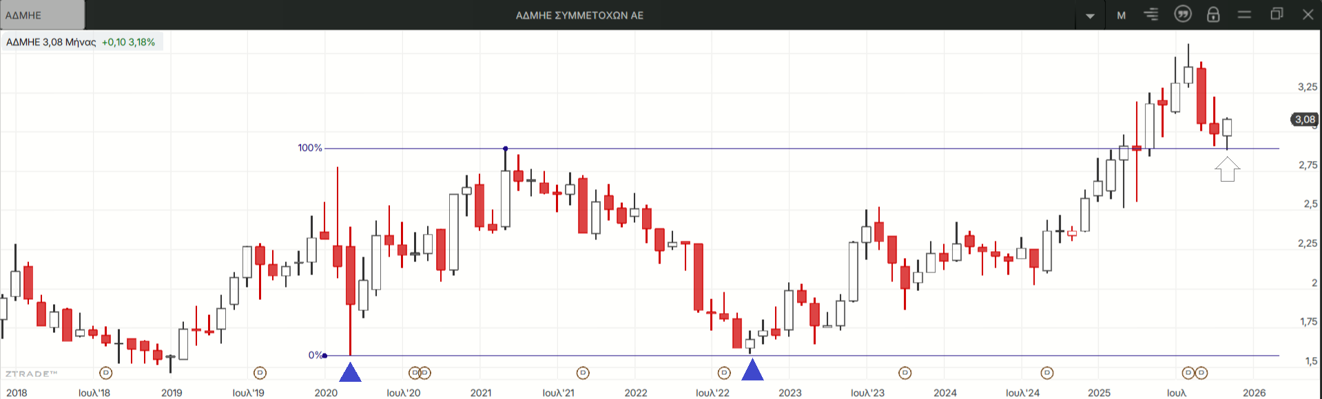 Η διόρθωση που ακολούθησε την αρνητική απόκλιση του εβδομαδιαίου RSI στα ιστορικά υψηλά του Αυγούστου σταμάτησε ακριβώς στη γραμμή ενεργοποίησης του μεγάλου σχηματισμού διπλού πυθμένα αφού πρώτα διέσπασε προσωρινά την οριζόντια στήριξη στα 2,91 ευρώ κατά τη συνεδρίαση της Τρίτης.