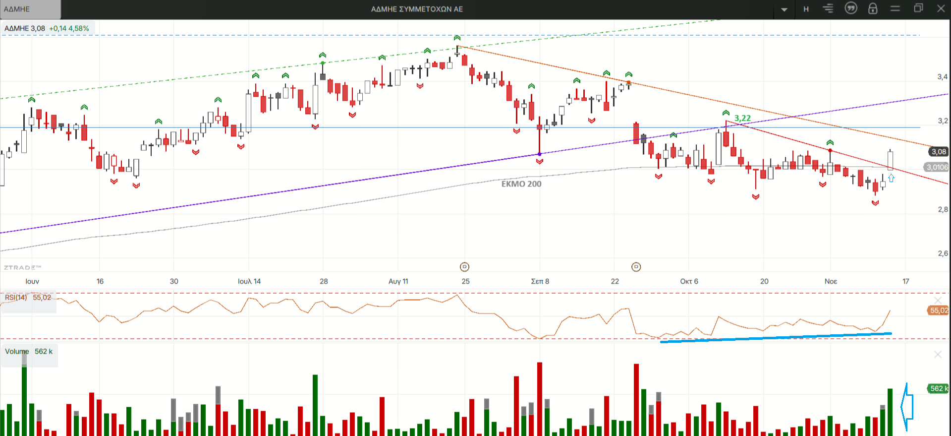 Αφύπνιση με μεγάλη αύξηση του τζίρου στον ΑΔΜΗΕ μετά την θετική απόκλιση του ημερήσιου RSI και μια πρώτη ανοδική διάσπαση της κατερχόμενης γραμμής τάσης αλλά και του κινητού 200 ημερών αφήνει ελπίδες υπέρβασης της οριζόντιας αντίστασης στα 3,22 ευρώ και επάνοδο σε ανοδική τάση.
