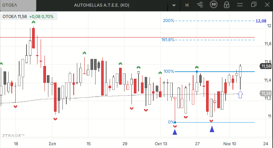 Στην ΟΤΟΕΛ είχαμε μια πρώτη ένδειξη την Τετάρτη για αλλαγή της βραχυπρόθεσμης τάσης σε ανοδική και χθες μια πρώτη επιβεβαίωσή της με την ενεργοποίηση σχηματισμού διπλού πυθμένα που θέτει στόχο τα 12,08 ευρώ.