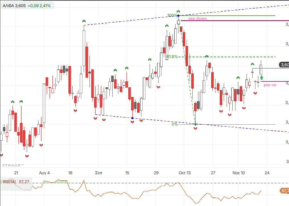 Η ΑΛΦΑ λοιπόν διέσπασε ανοδικά την οριζόντια αντίσταση από το υψηλότερο των δυο τελευταίων τοπικών υψηλών της στο ημερήσιο κι έτσι λογίζεται σε ανοδική τάση και στο ημερήσιο. Άφησε πάντως ένα ανοδικό gap που κλείνει στο προχθεσινό κλείσιμο.