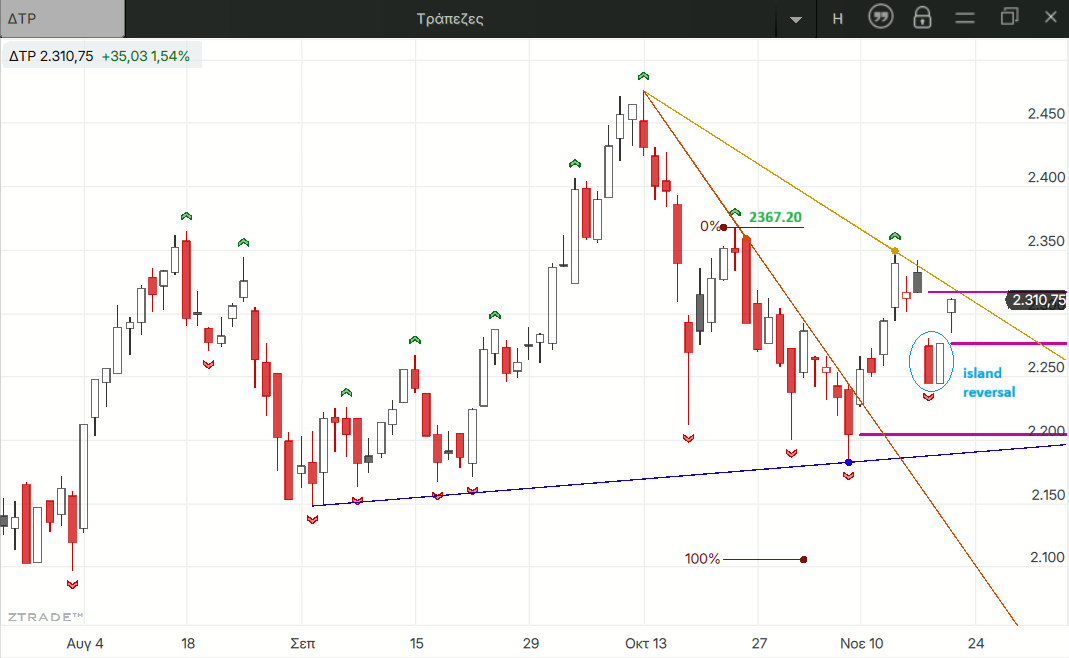 Τον πιο σημαντικό ρόλο στην καλή χθεσινή εικόνα έπαιξαν πάλι οι συστημικές τράπεζες με τον ΔΤΡ να αφήνει μια νησίδα αντιστροφής αλλά χωρίς να κλείσει το καθοδικό gap του ή να διασπάσει την κατερχόμενη γραμμή τάσης και βέβαια χωρίς να διασπάσει τα τελευταία τοπικά υψηλά του όπως έκανε η ΑΛΦΑ που ακολουθεί