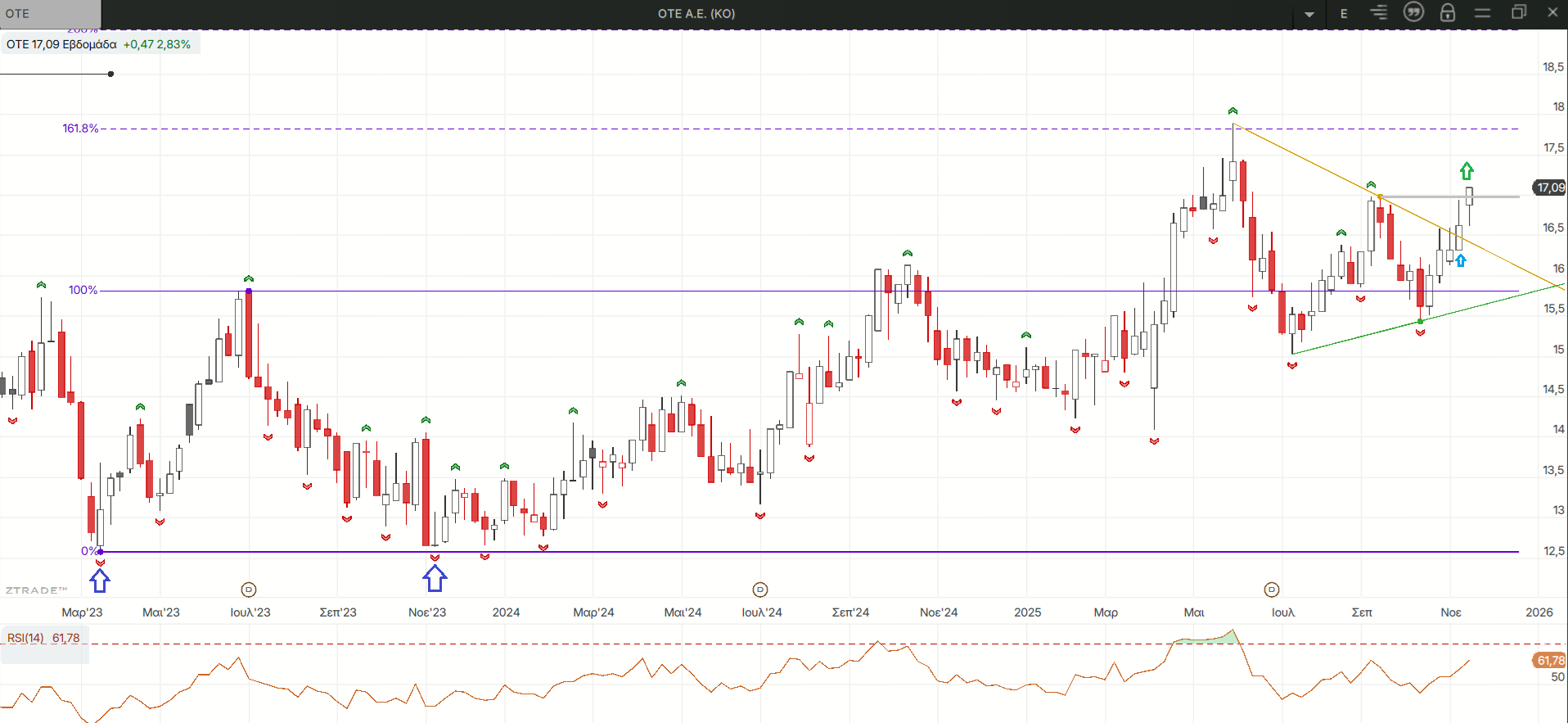 Εξ’ ίσου σημαντική ήταν κι η συμβολή του ΟΤΕ που διέσπασε το υψηλότερο από τα δυο τελευταία τοπικά υψηλά του στο εβδομαδιαίο και πλέον λογίζεται σε ανοδική τάση και στο εβδομαδιαίο, περνώντας και το 61,8% fibo ανοδικής διόρθωσης όλης της πτώσης από τον 1ο στόχο του μεγάλου σχηματισμού διπλού πυθμένα του.
