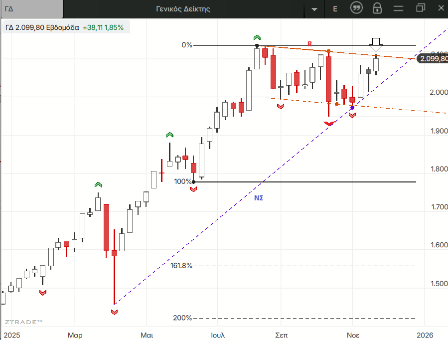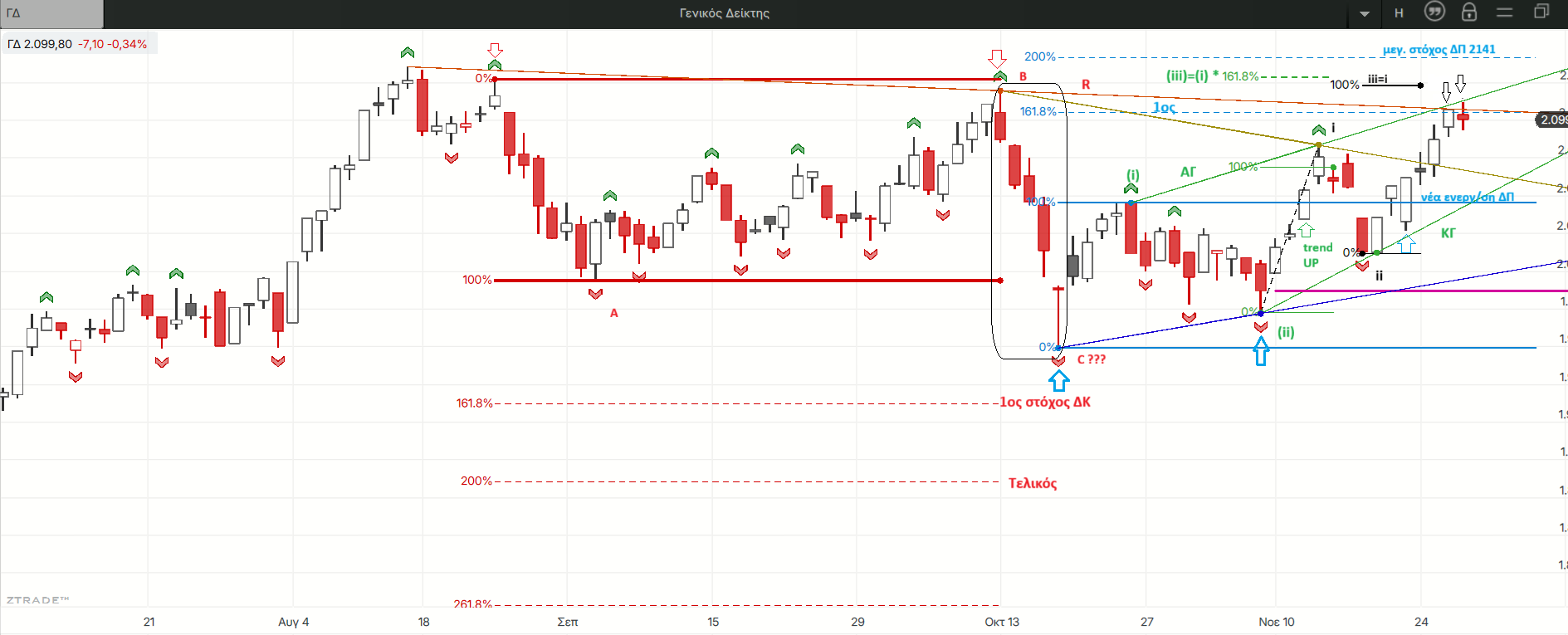 Στις τιμές του ΓΔ είχαμε για δεύτερη συνεχόμενη μέρα στοπ πάνω στην R, την τελευταία κατερχόμενη γραμμή τάσης και λίγο πριν το υψηλό του εβδομαδιαίου κεριού στα μέσα του Οκτωβρίου όπως είδαμε και στον FTSE. Στο ημερήσιο διάγραμμα του δείκτη μπορούμε να θυμηθούμε τους σχηματισμούς και τα σημαντικά τεχνικά σημεία που είναι πιθανώς αναλογίες που μπορεί να δουν οι τιμές στη συνέχεια. Η τάση στο ημερήσιο είναι επιβεβαιωμένα ανοδική όπως και στο εβδομαδιαίο.