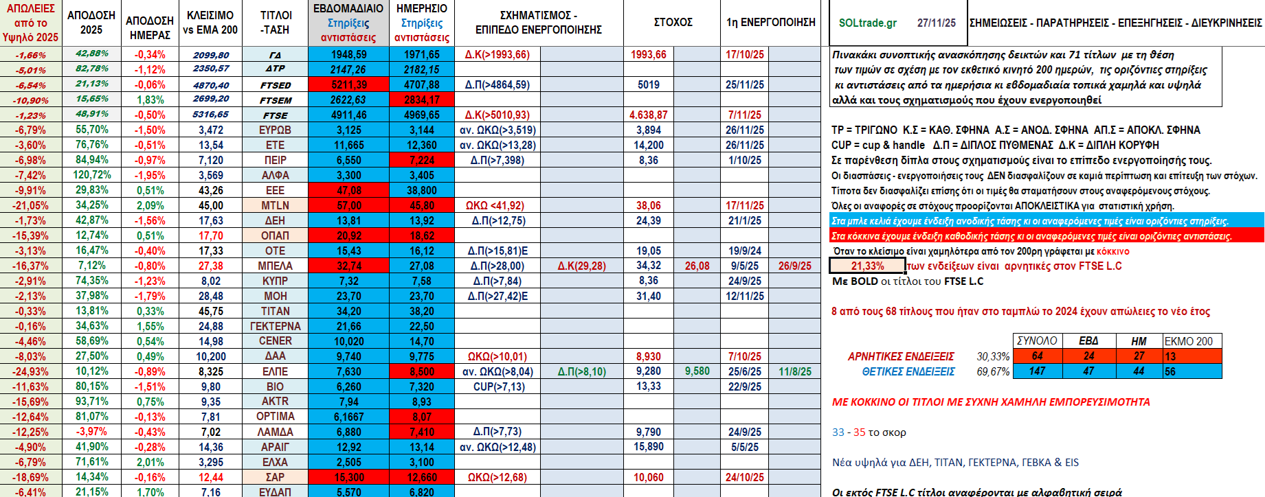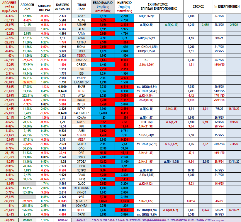 Μια ακόμα συνεδρίαση με μοιρασμένα και πάλι τα πρόσημα στο κλείσιμο, με τους τίτλους μικρότερης κεφαλαιοποίησης να έχουν συνολικά καλύτερη εικόνα χθες από τα βαριά χαρτιά. Σε νέα υψηλά έφασε Η ΔΕΗ πριν διορθώσει λίγο, ο Τιτάνας που έπιασε το μέγιστο στόχο της διάσπασης της κατερχόμενης σφήνας του καθώς και η ΓΕΚΤΕΡΝΑ από τα μεγαλομεσαία και οι ΓΕΒΚΑ και ΕΙS από τα μικρά. Η συνολική εικόνα παρουσίασε νέα μικρή βελτίωση καθώς κάποιοι τίτλοι πέρασαν πάνω από το 200ρη τους αλλά δεν είχαμε κάποια αξιοσημείωτη αλλαγή πέρα της αξιόλογης αντίδρασης στην ΙΝΛΟΤ που έδωσε και το θετικό πρόσημο στον FTSEM σε αντίθεση με τους μεγάλους δείκτες. Καμία μεταβολή ενδείξεων δεν είχαμε στην πρώτη ενδεκάδα των πιο βαριών χαρτιών του ταμπλώ από τα οποία ξεχώρισε και πάλι η MTLN όπως βλέπουμε στο επικαιροποιημένο πινακάκι συνοπτικής ανασκόπησης που ακολουθεί. Oι αρνητικές ενδείξεις στους τίτλους του FTSE L.C είναι αρκετά λιγότερες αναλογικά από τους υπόλοιπους τίτλους όπως βλέπουμε στις παρατηρήσεις.